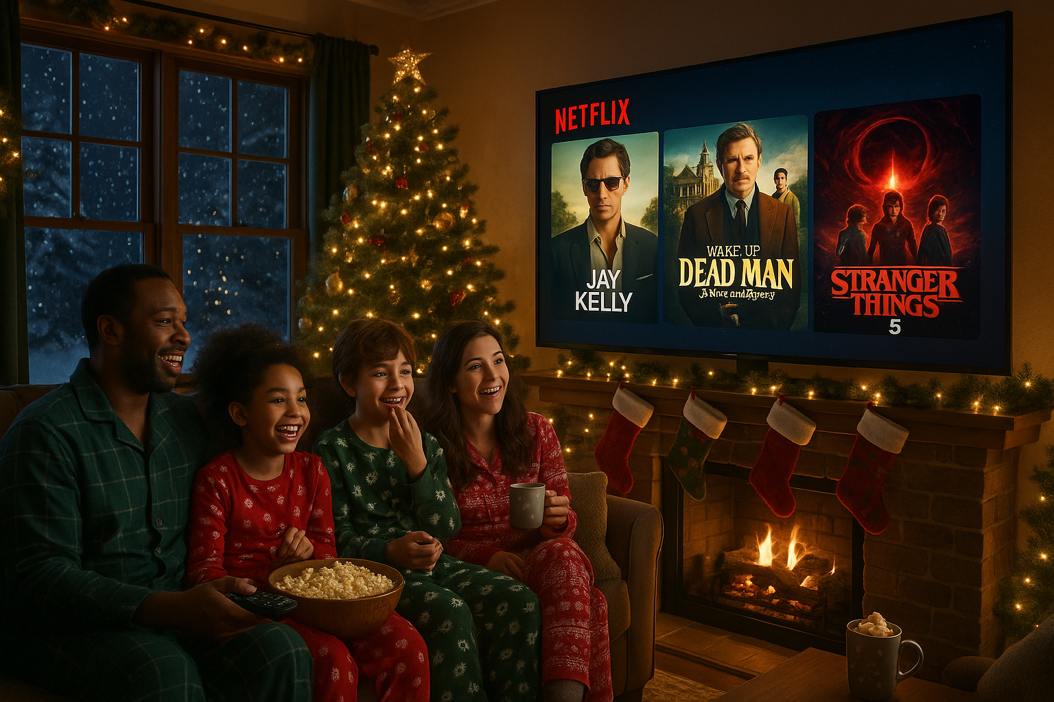 Illustration of a family enjoying Netflix's December 2025 holiday lineup on TV, featuring 'Jay Kelly,' 'Wake Up Dead Man: A Knives Out Mystery,' and 'Stranger Things' Season 5 in a cozy, festive living room.