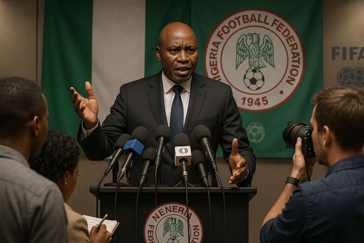 Dramatic illustration of Nigerian officials filing a FIFA complaint against DR Congo over ineligible players, threatening World Cup qualification.