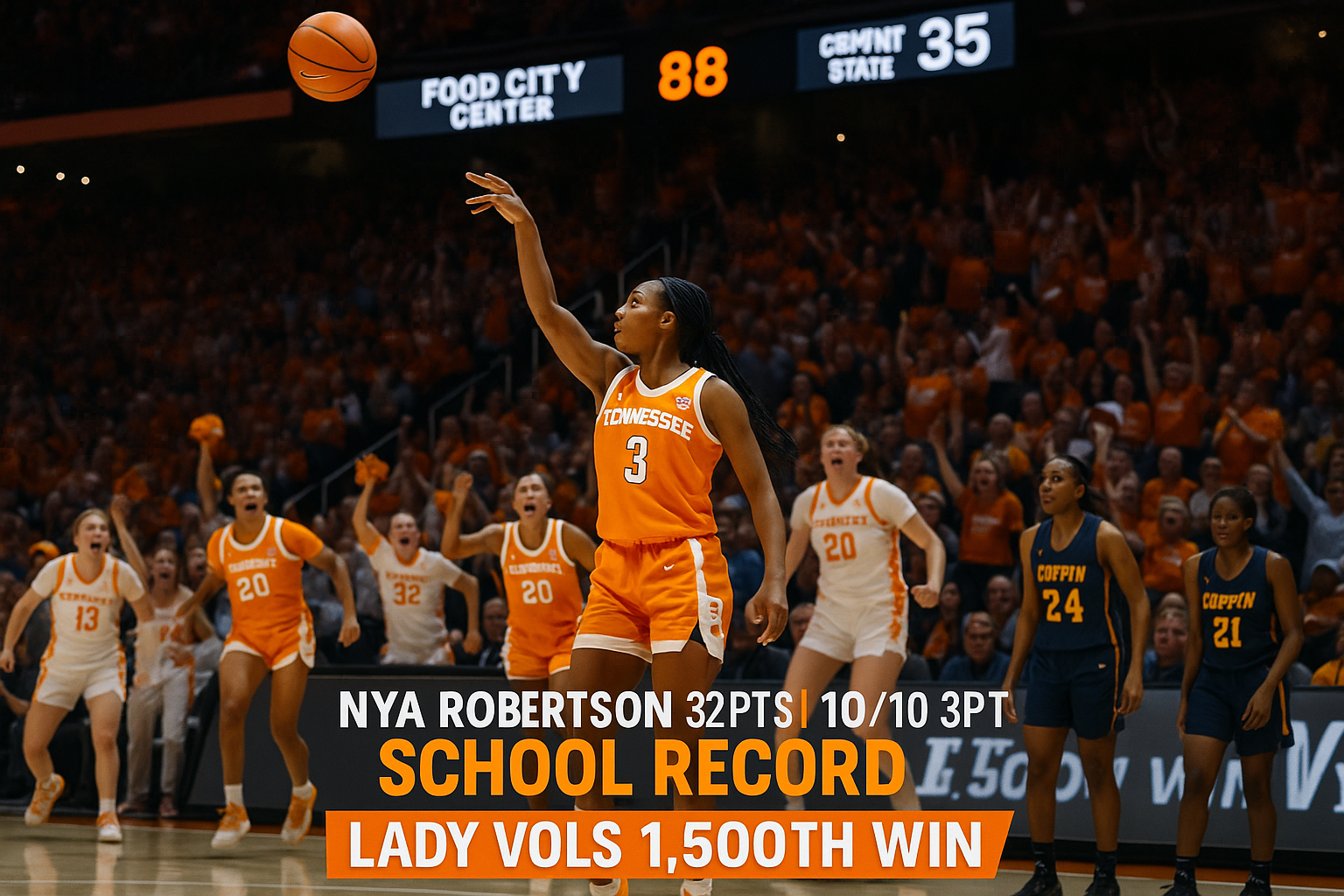 Nya Robertson set a school record with 10 three-pointers and scored 32 points as the No. 13 Tennessee Lady Vols routed Coppin State 88-35 on Nov. 23 at Food City Center. The victory marked the program's 1,500th win. Tennessee forced a season-high 36 turnovers in the dominant performance.
