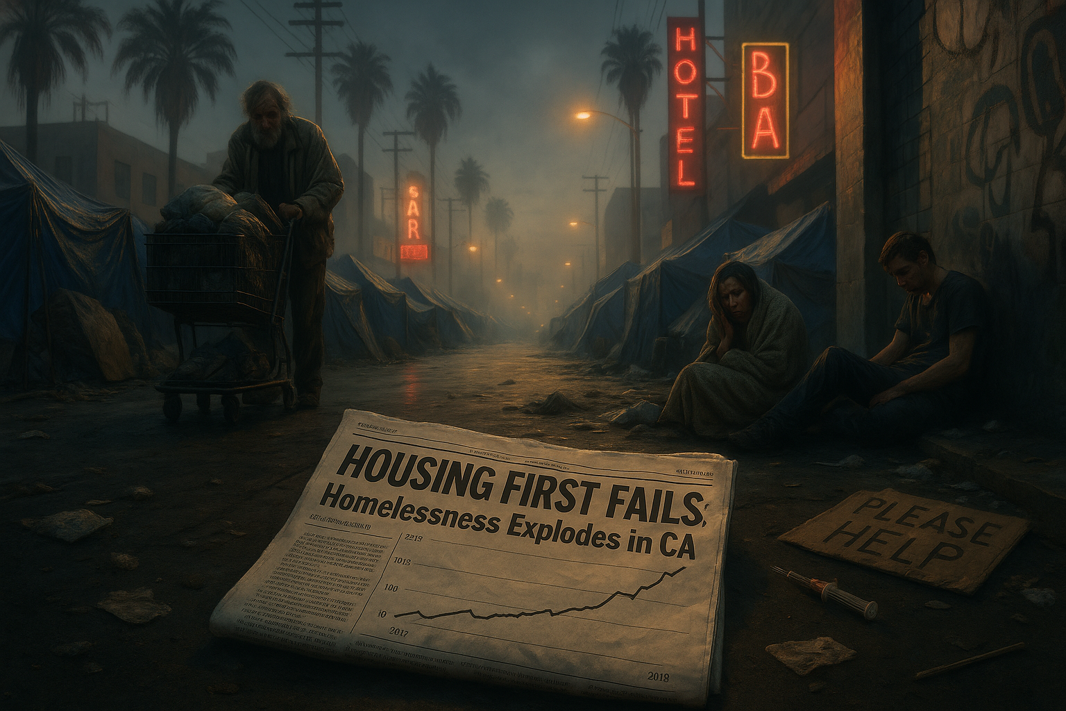 Realistic illustration of a Los Angeles homeless encampment symbolizing the criticized failure of the 'Housing First' policy amid rising unsheltered populations in California.