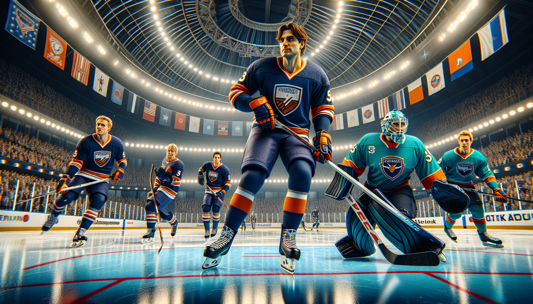 Vivid photo illustration of the Chicago Blackhawks versus Seattle Kraken hockey game at Climate Pledge Arena, showing players on the ice and cheering fans.