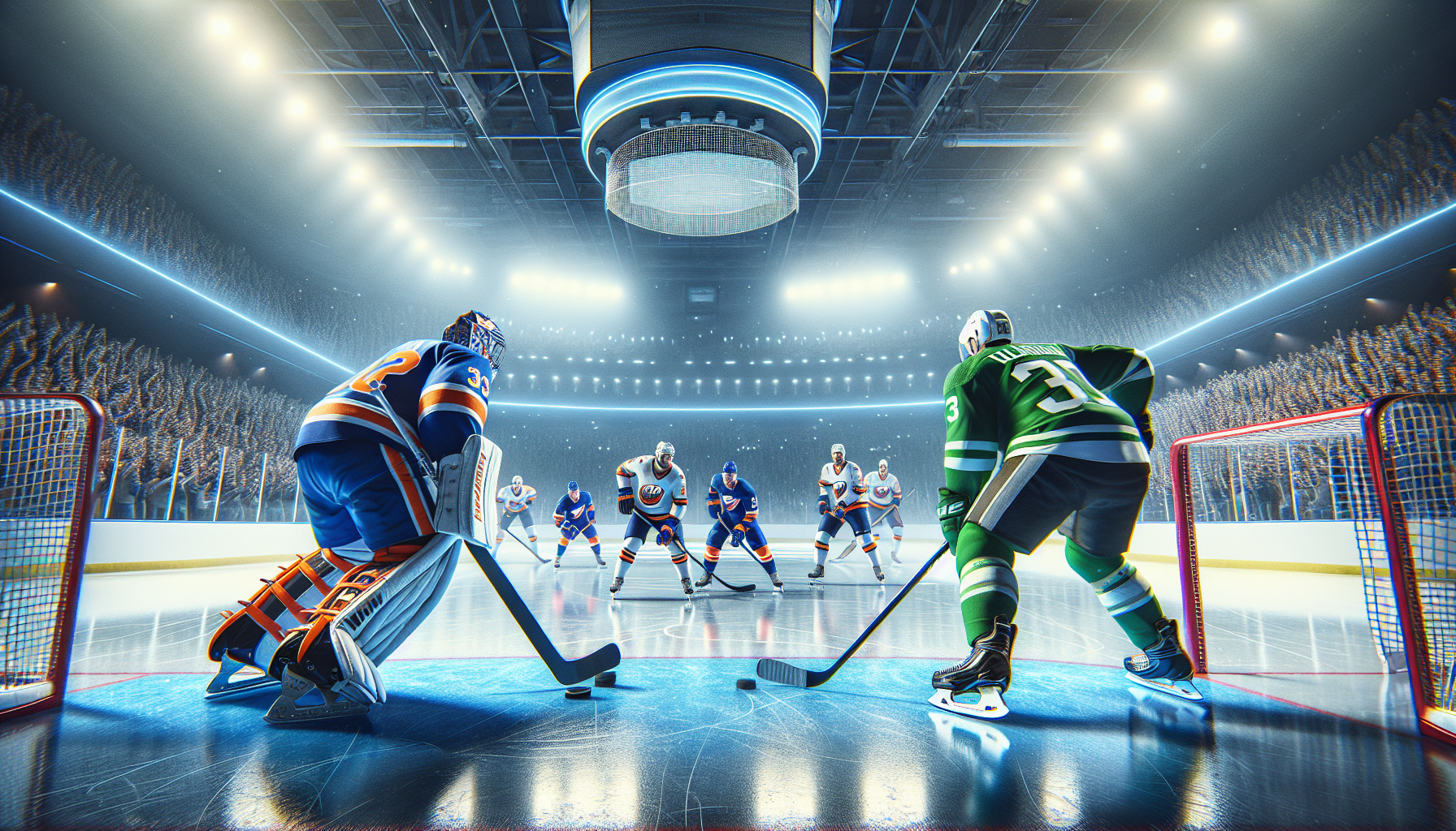 Edmonton Oilers goalie Stuart Skinner and Dallas Stars goalie Casey DeSmith face off on the ice at American Airlines Center, illustrating the upcoming NHL game with players in action and a lively crowd.