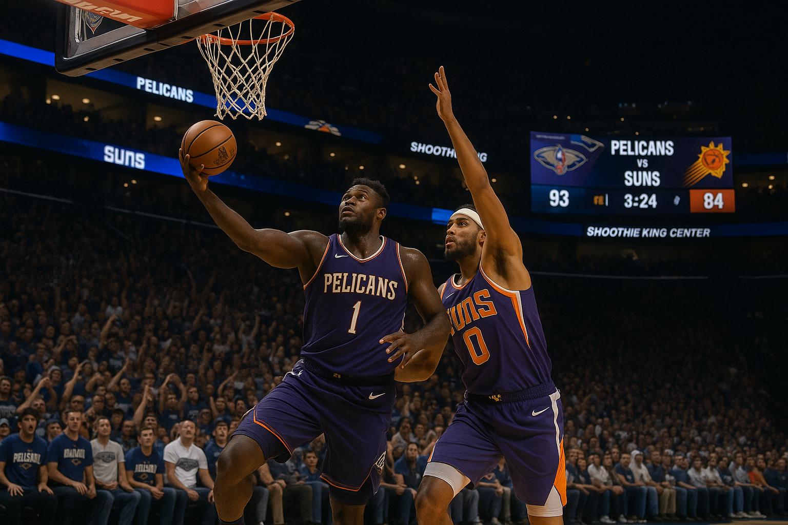 Dynamic NBA action shot of Pelicans hosting Suns on Dec. 27, 2025, for news article.