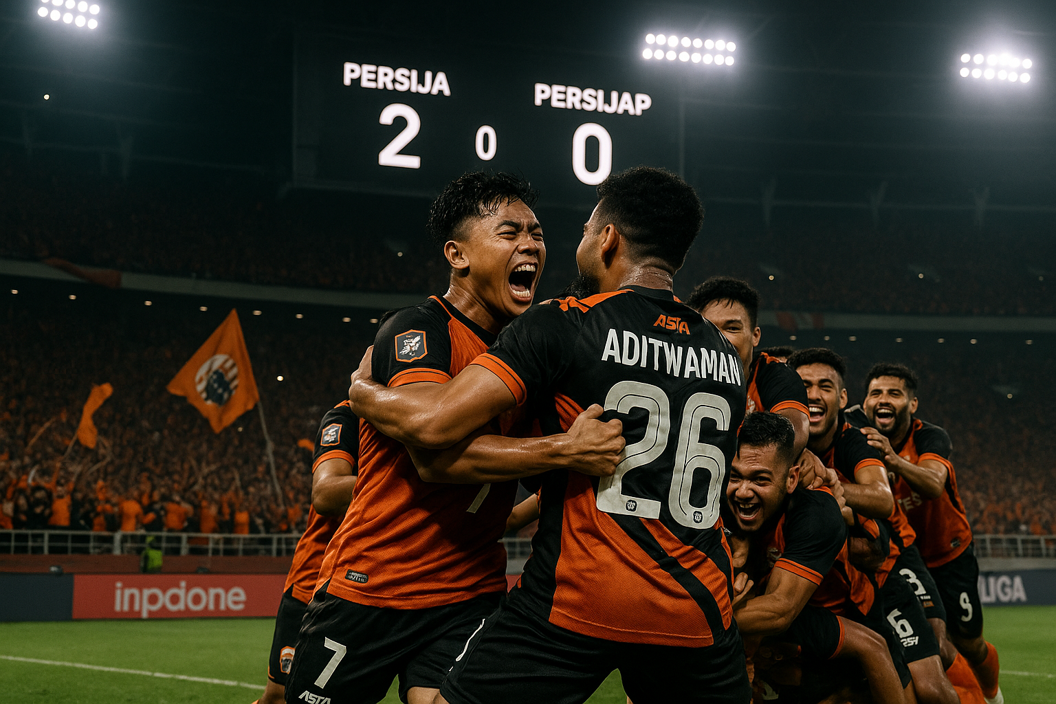 Persija Jakarta players celebrate 2-0 win over Persijap Jepara at Gelora Bung Karno Stadium, rising to second in the league.