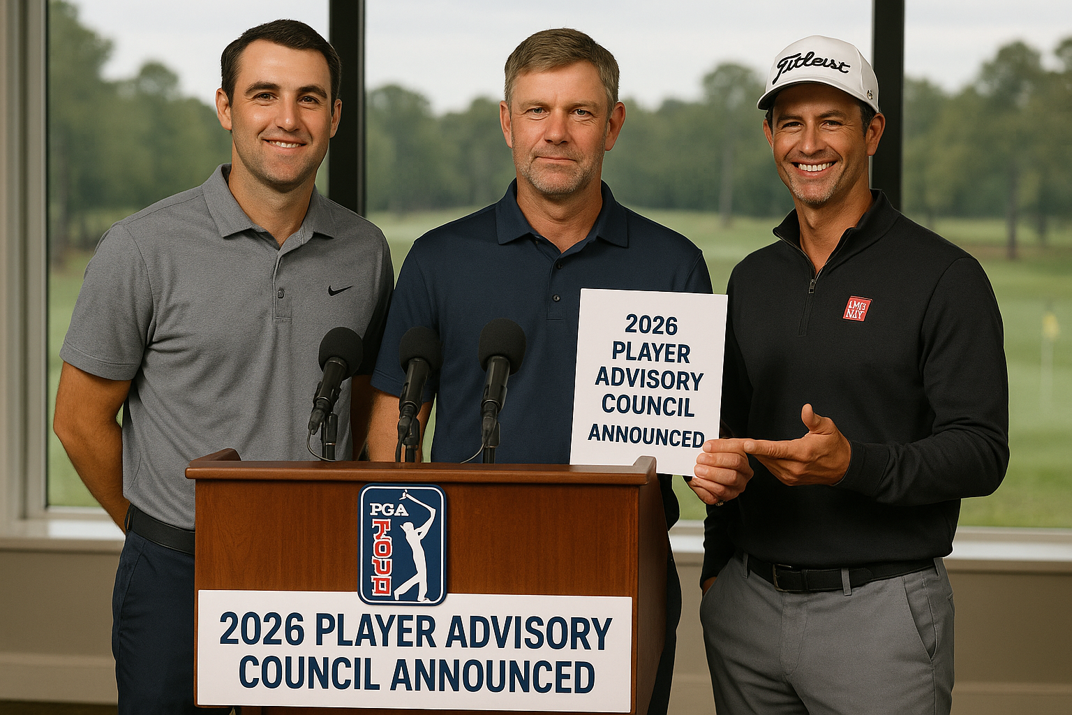 PGA Tour golfers Scottie Scheffler, Lucas Glover, and Adam Scott at press conference for 2026 Player Advisory Council announcement.