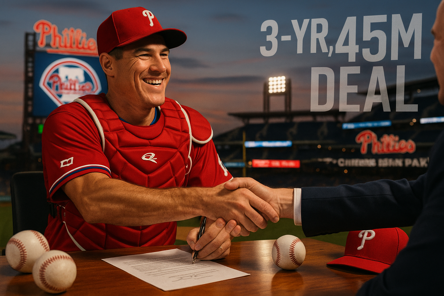 The Philadelphia Phillies have agreed to a three-year, $45 million deal with catcher J.T. Realmuto, pending a physical, after missing out on free-agent infielder Bo Bichette. The contract includes incentives that could add $5 million per year, bringing the total value to $60 million. This move provides stability behind the plate for the Phillies' pitching staff entering the 2026 season.