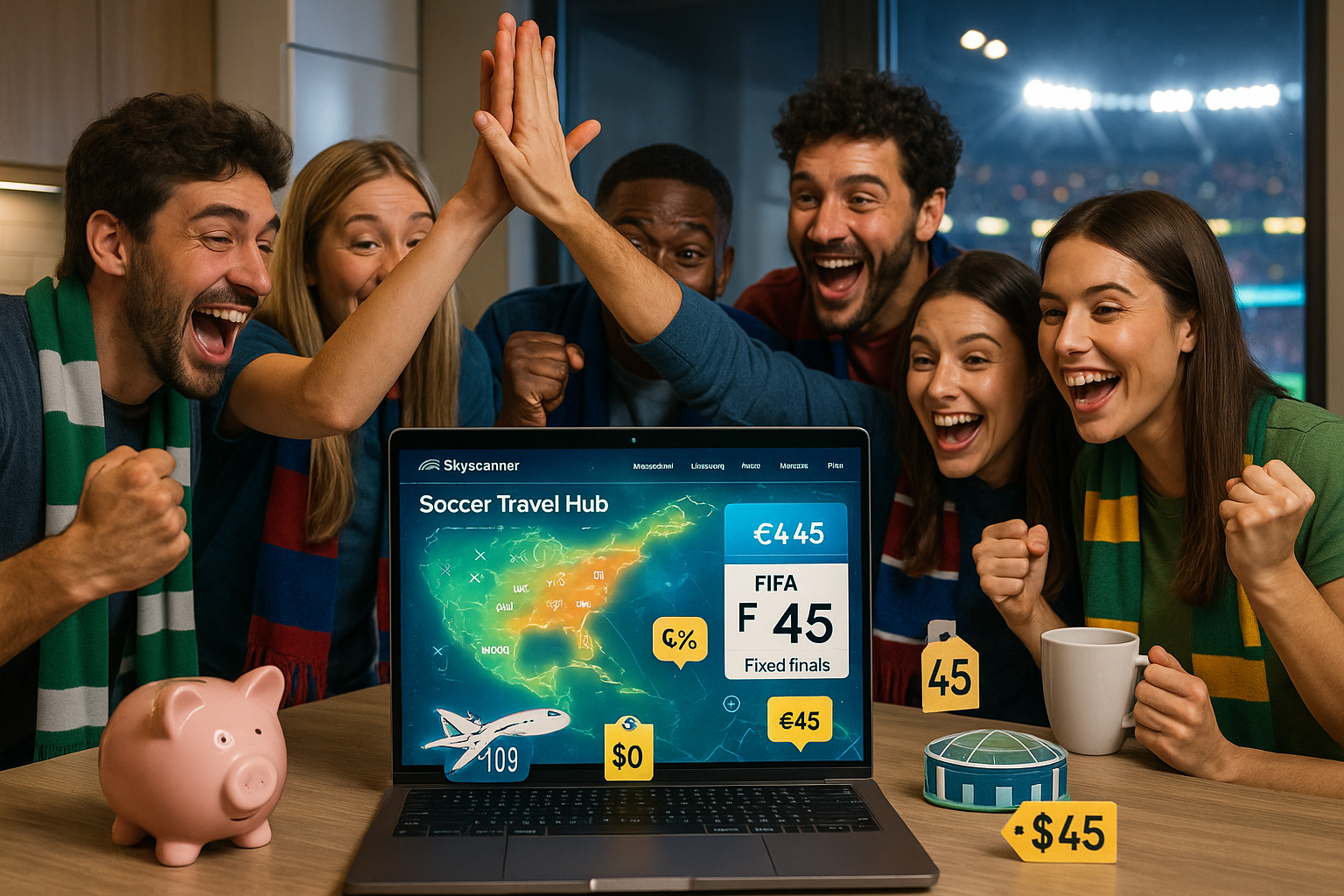Illustration of soccer fans using online tools to plan affordable trips to the 2026 FIFA World Cup across North America.