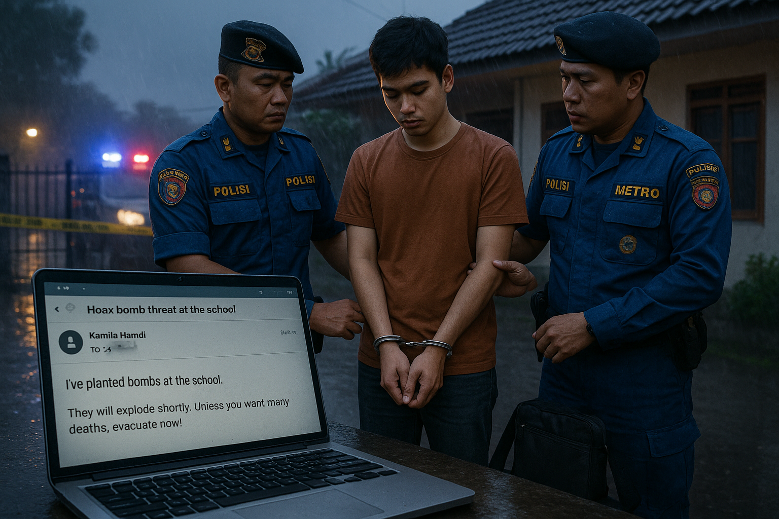 In an update to the hoax bomb threats targeting 10 Depok schools, Metro Police have named 23-year-old H as the suspect. He sent fake emails impersonating ex-girlfriend Kamila Hamdi using a random 'AI-like' method, motivated by a rejected marriage proposal and desire for attention.
