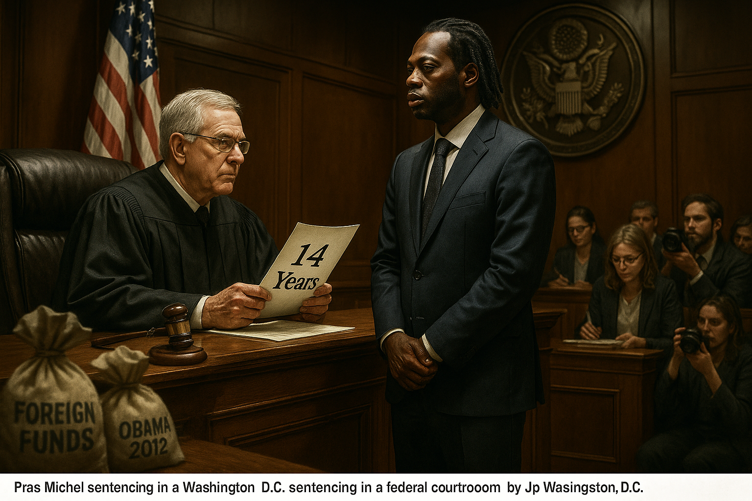 Realistic illustration of rapper Pras Michel sentenced to 14 years in D.C. courtroom for illegal Obama campaign donations.