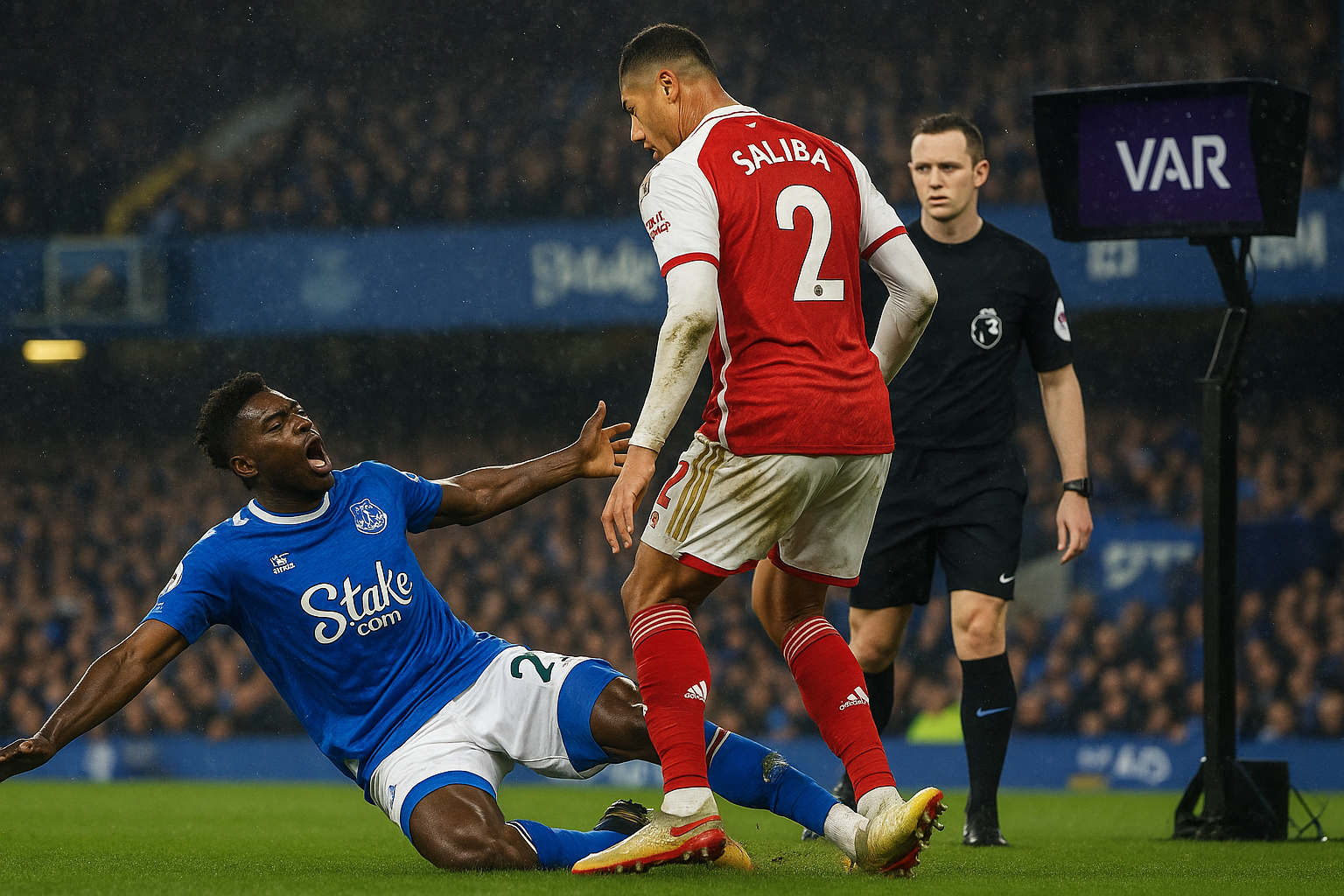 Dramatic illustration of the controversial moment when Arsenal's William Saliba fouled Everton's Thierno Barry in the penalty area, a penalty the Premier League panel ruled should have been awarded.