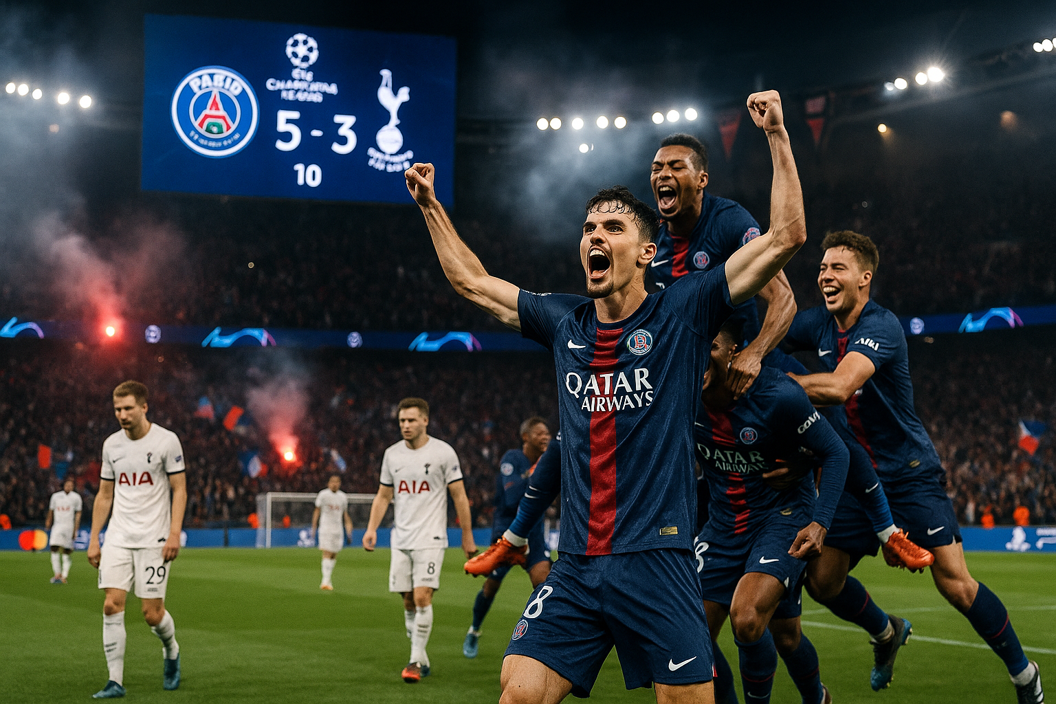 PSG celebrates 5-3 Champions League win over Tottenham at Parc des Princes, Vitinha hat-trick hero amid jubilant fans.