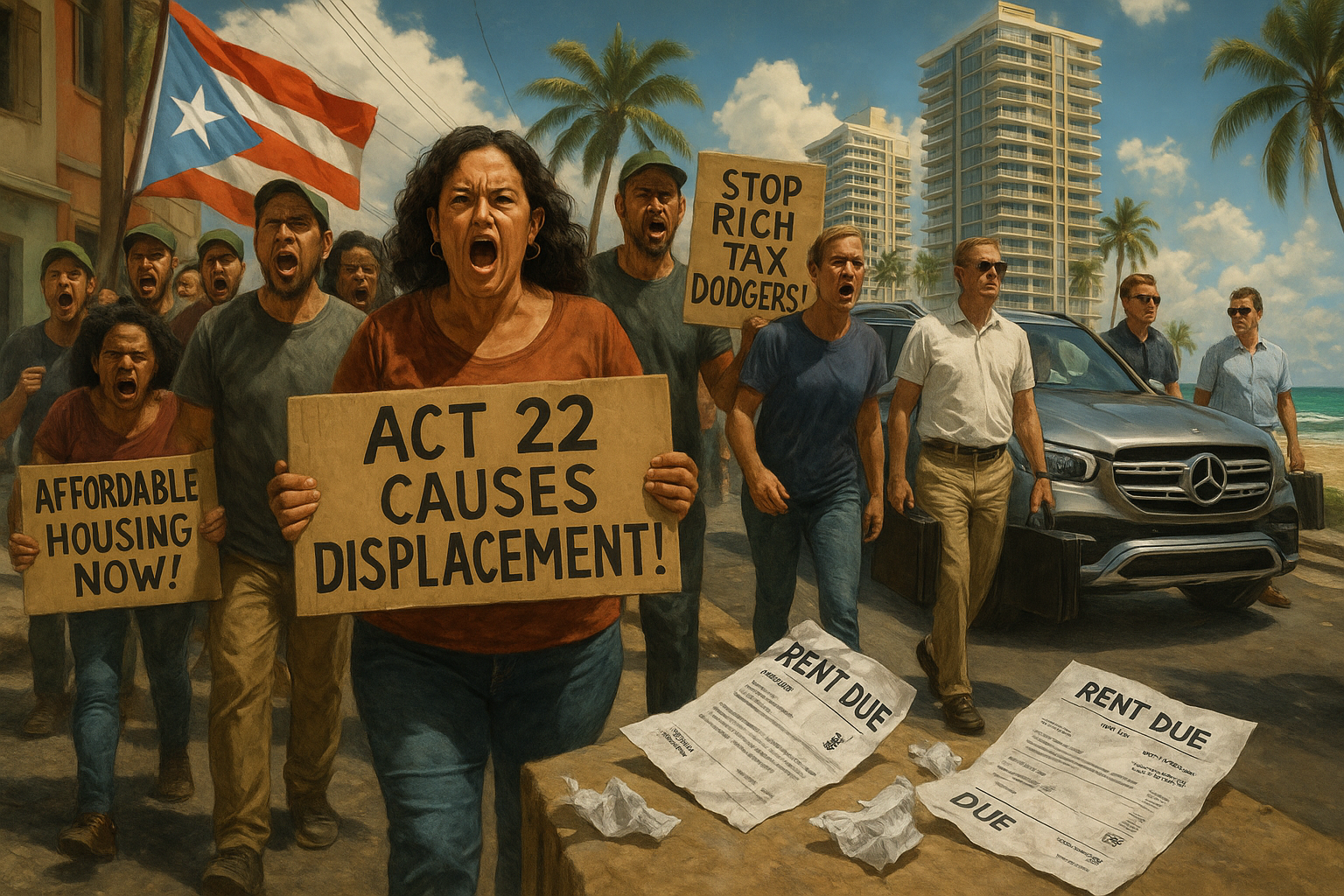 Protest scene in Puerto Rico highlighting Act 22 tax breaks' role in local displacement and housing crisis, contrasting struggling residents with arriving wealthy investors.
