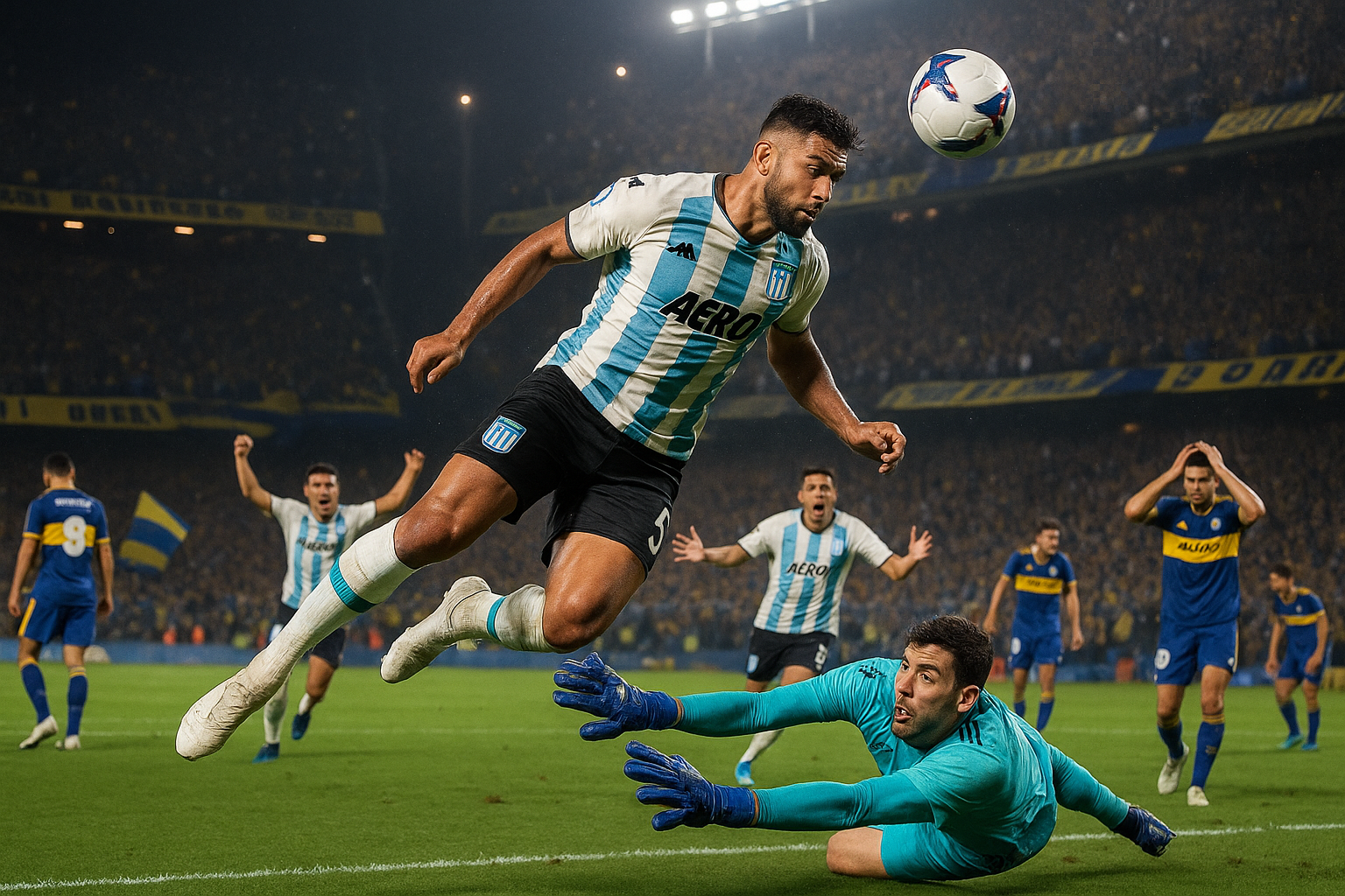 Racing Club's Adrián Martínez scores the header that beats Boca Juniors 1-0 at La Bombonera, advancing to the Torneo Clausura final.