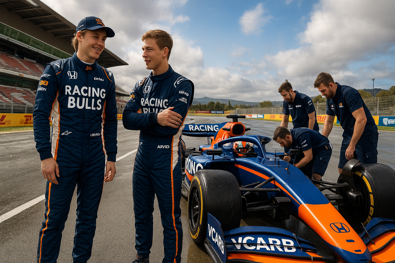 Racing Bulls F1 drivers Liam Lawson and Arvid Lindblad with VCARB 03 car during successful Barcelona shakedown.
