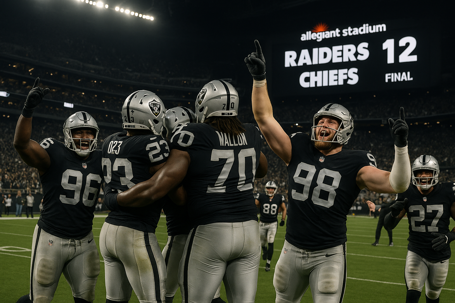 Raiders players celebrate clinching the No. 1 pick in 2026 NFL Draft after 14-12 win over Chiefs.