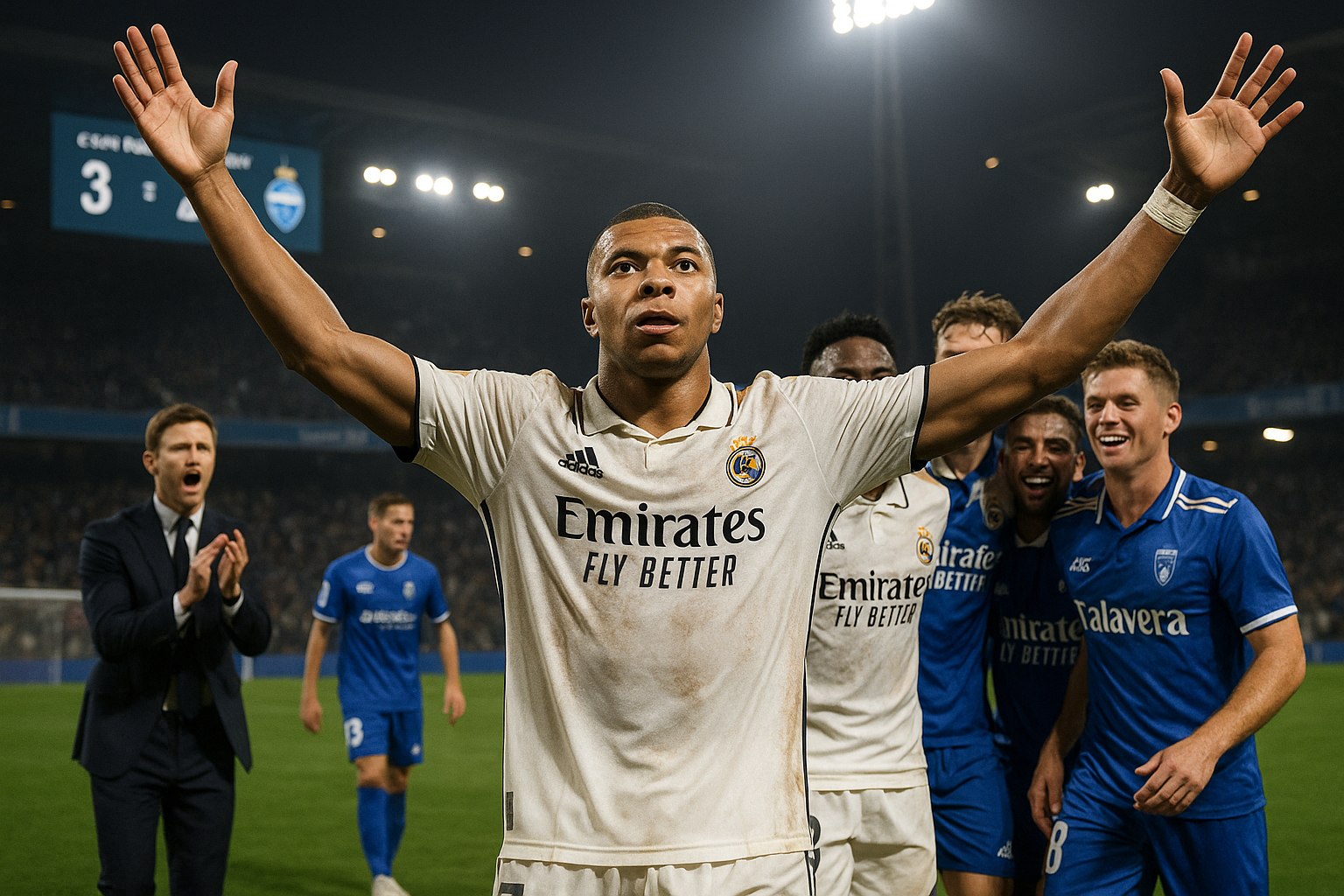 In a match that saw Real Madrid surge to a 2-0 halftime lead via Mbappé's penalty and an own goal off his cross—before Talavera clawed back to 3-2 with strikes from Nahuel Arroyo and Gonzalo Di Renzo—Los Blancos held firm thanks to Andriy Lunin's stoppage-time heroics on the line.