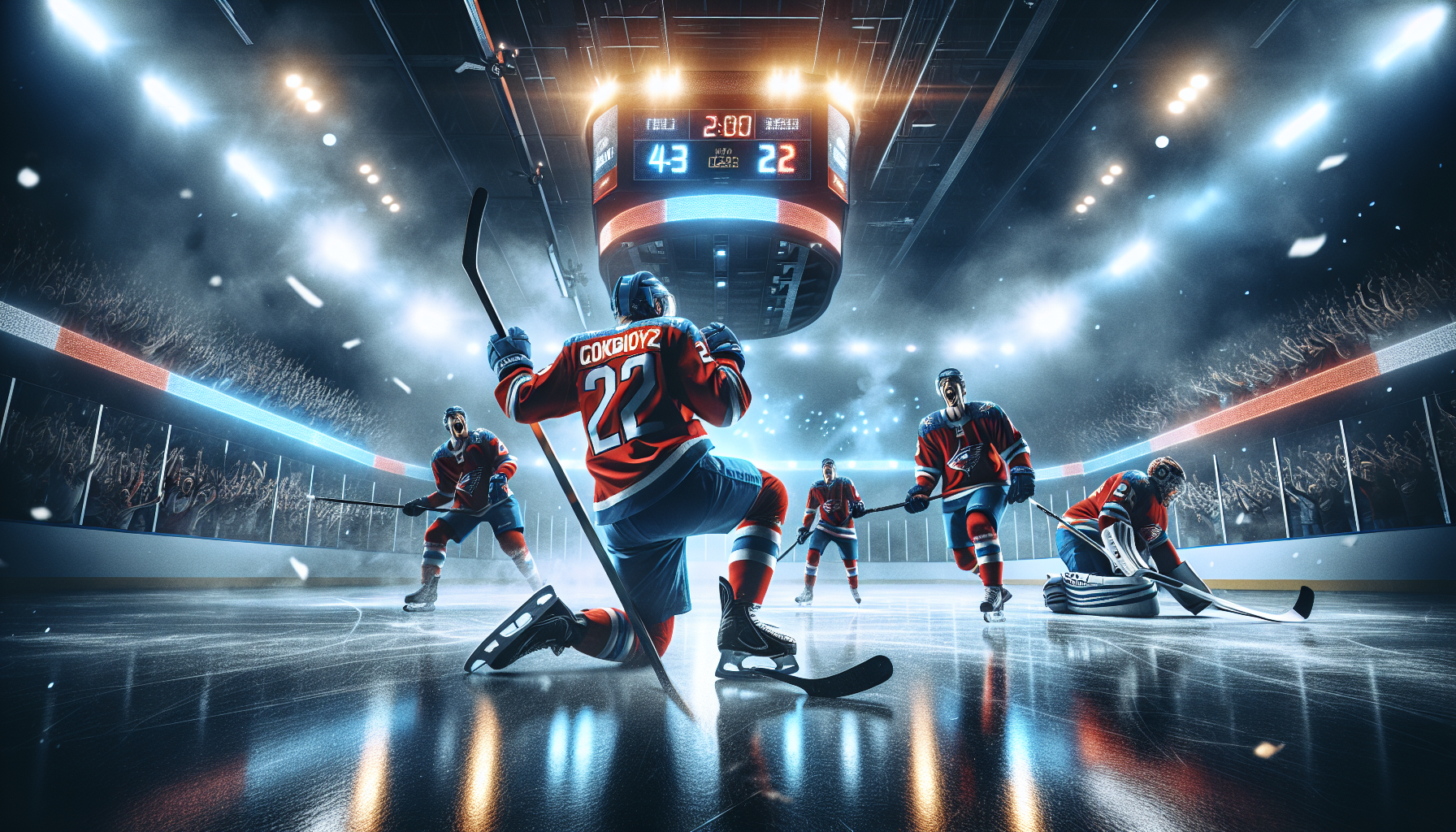 Detroit Red Wings captain Dylan Larkin and teammates celebrating a goal in their 4-2 victory over the Edmonton Oilers at Little Caesars Arena, extending their win streak to five.