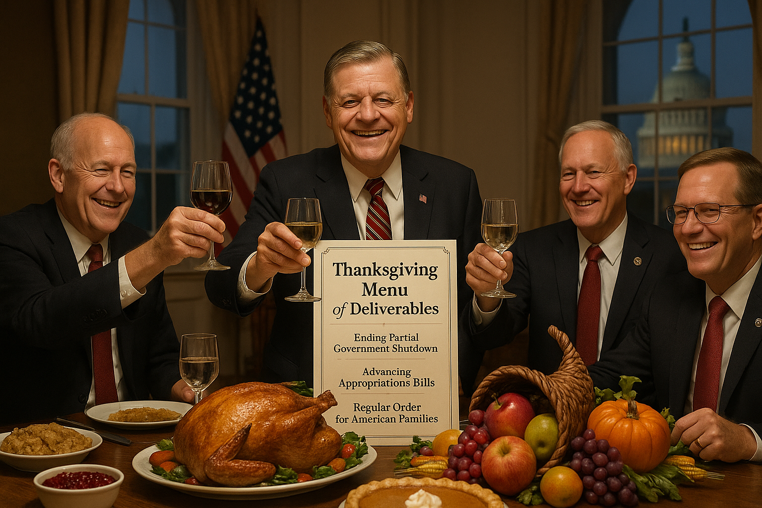 Republican lawmakers at Thanksgiving table toasting legislative achievements like shutdown resolution and spending bills via themed menu.