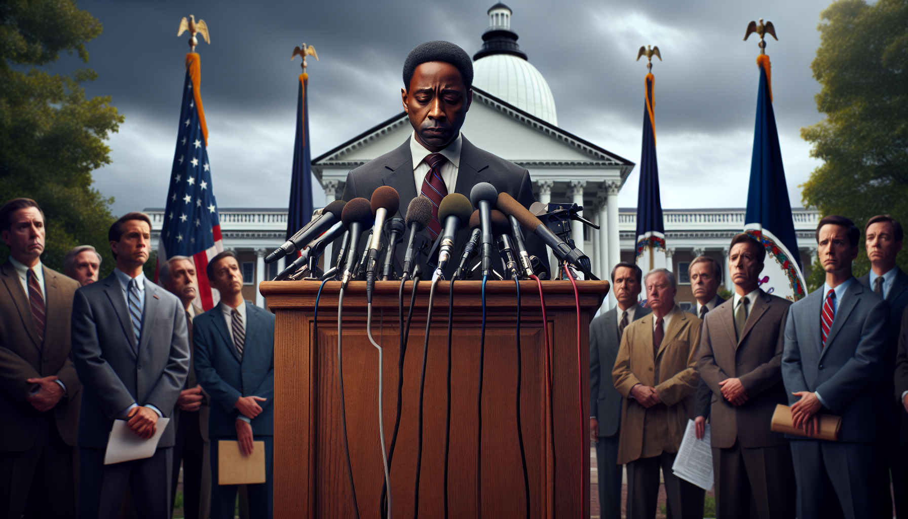 Virginia AG candidate Jay Jones at a press conference apologizing for controversial texts, with reporters and state capitol in background.