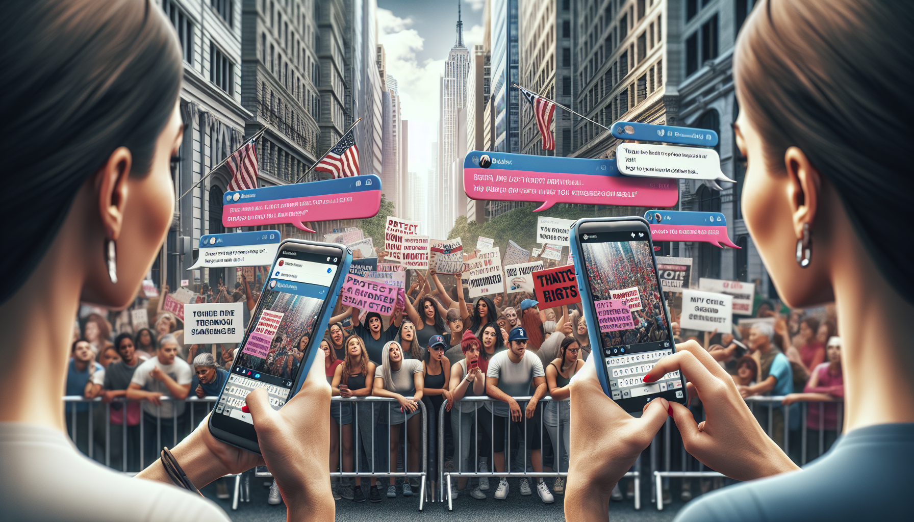 Illustration depicting Riley Gaines at a NYC rally and Alexandria Ocasio-Cortez responding online, highlighting their feud over transgender participation in women's sports.