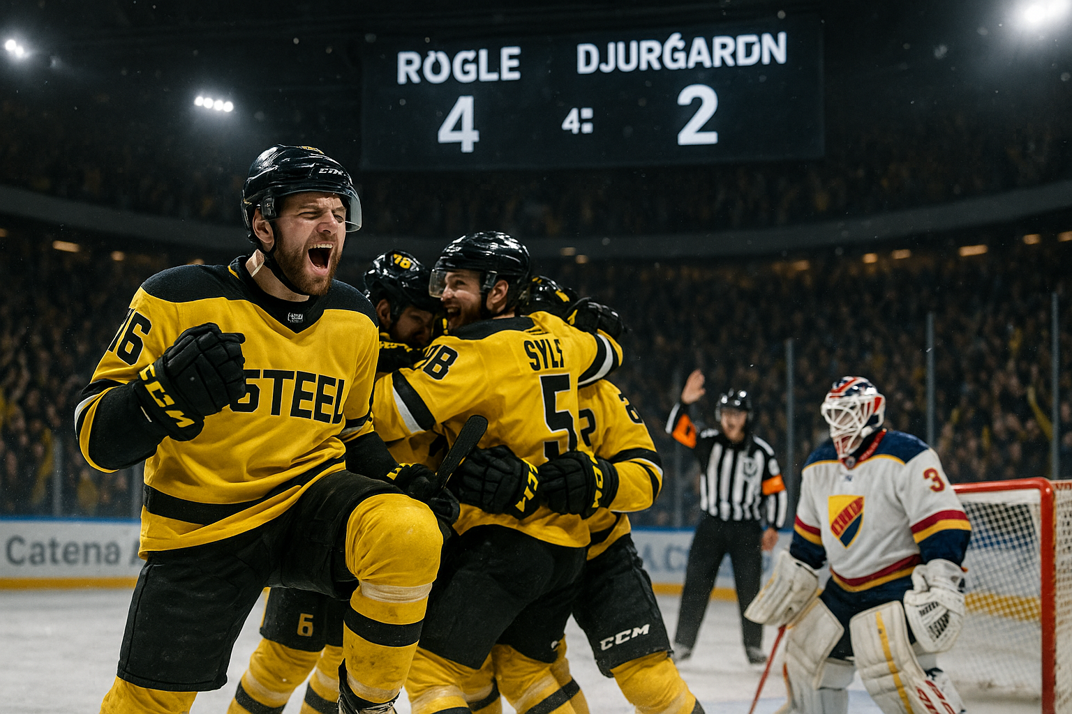 Rögle BK celebrates thrilling 4-2 comeback win over Djurgården in Marmenlind's SHL debut, with key game action.