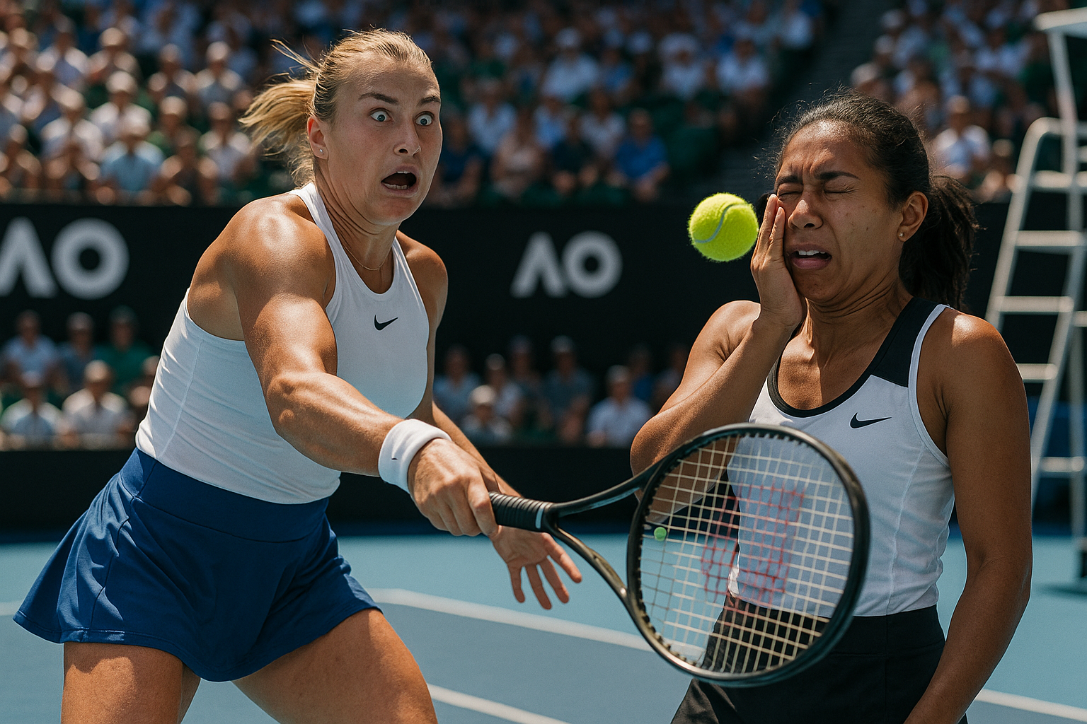 Aryna Sabalenka accidentally hits opponent Tiantsoa Rakotomanga Rajaonah in the face with a tennis ball during their Australian Open match.