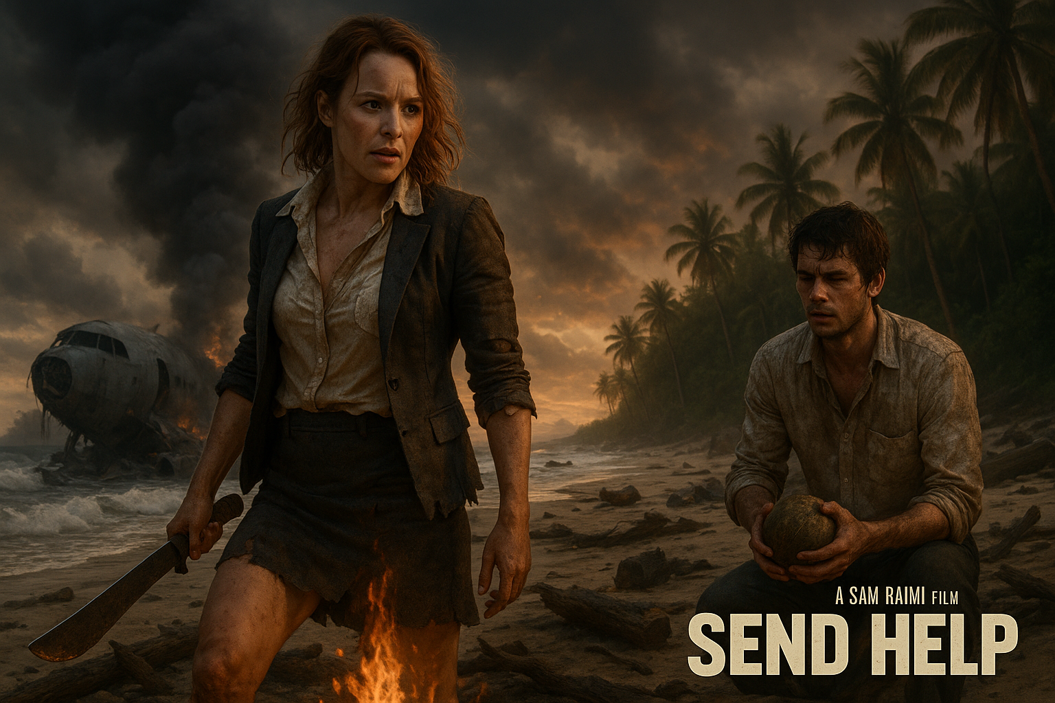 Rachel McAdams and Dylan O’Brien as survivors on a desert island in Sam Raimi’s thriller 'Send Help', amid plane wreckage and tropical beach.