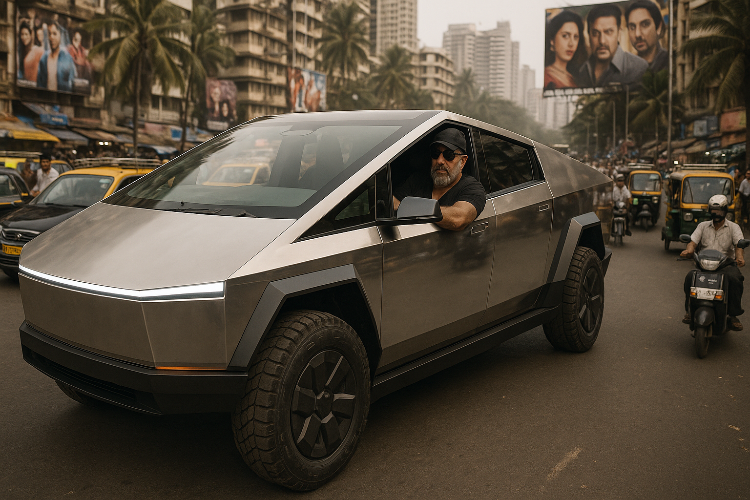 Sanjay Dutt driving Tesla Cybertruck amid Mumbai traffic, viral celebrity sighting.