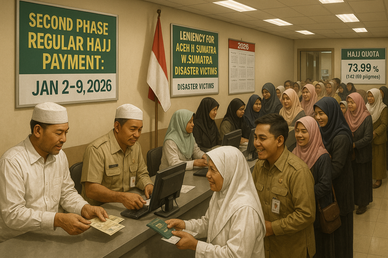 Indonesian pilgrims queuing and paying at Hajj registration office for second phase, with posters on 2026 dates and disaster leniency policies.