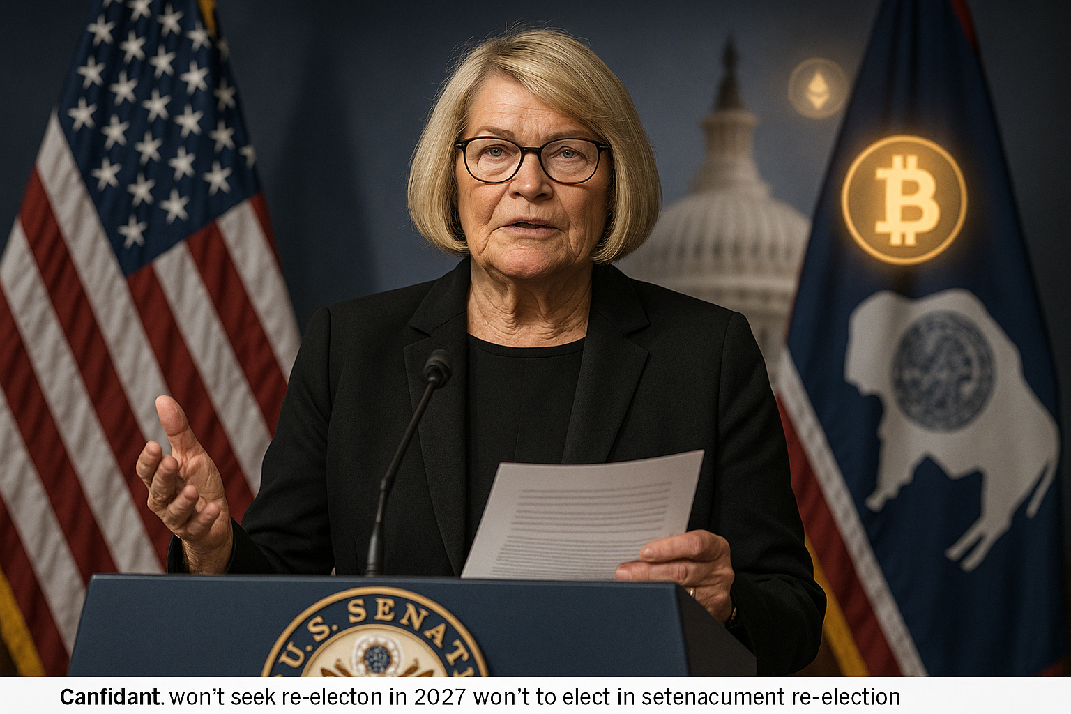 Sen. Cynthia Lummis at podium announcing no re-election bid, with crypto elements in background.