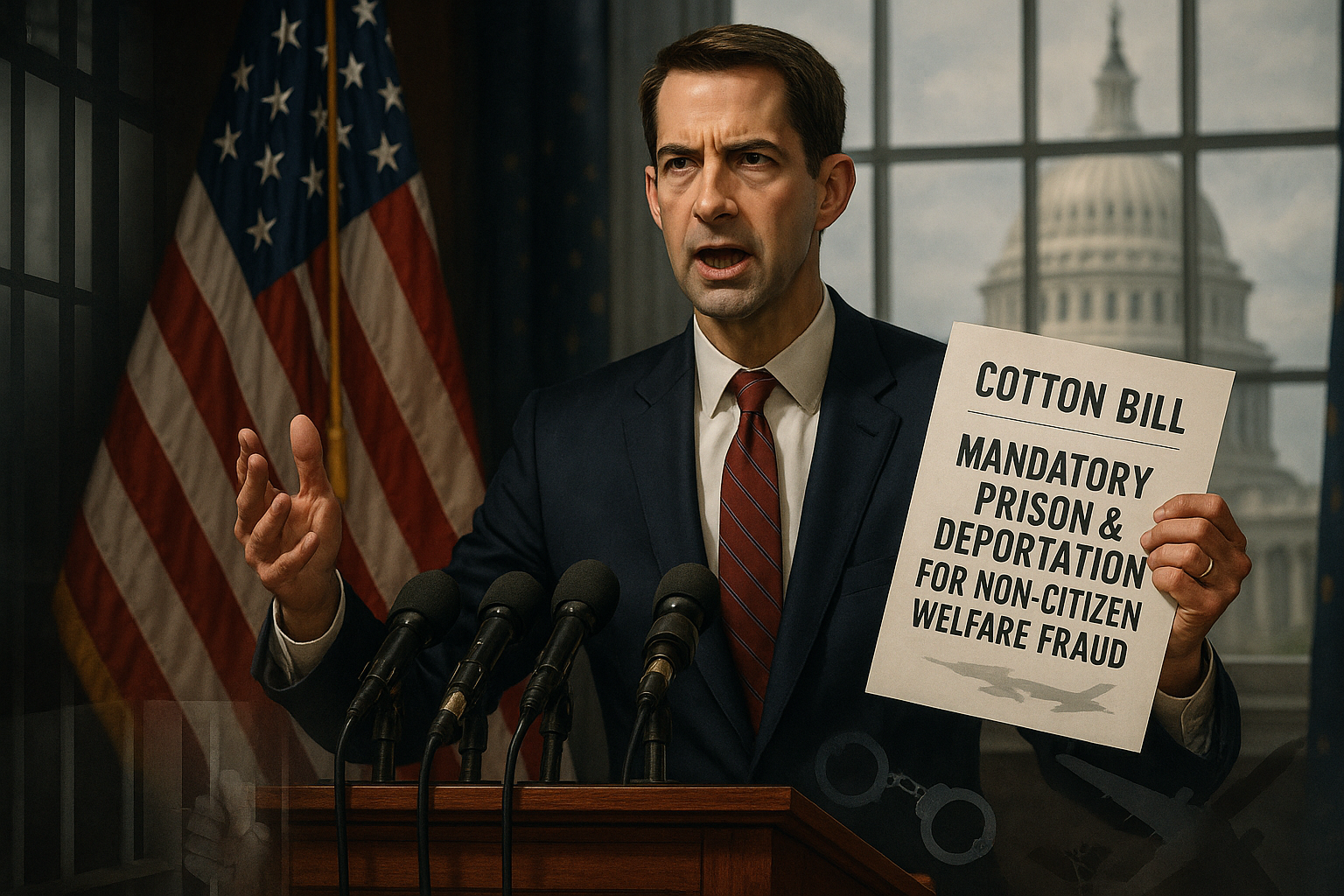 Sen. Tom Cotton, an Arkansas Republican, introduced legislation that would require mandatory minimum prison sentences for certain non-citizens and naturalized Americans convicted of stealing federal welfare funds, and would pair those penalties with expanded immigration consequences including expedited deportation in some cases.