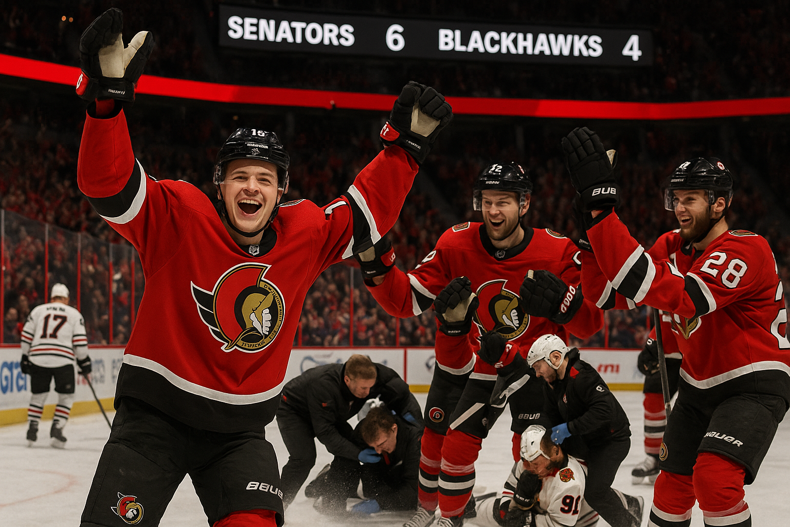 Dramatic hockey scene: Ottawa Senators celebrate 6-4 win over Chicago Blackhawks, Tim Stützle joyful amid Frank Nazar's facial injury on ice.