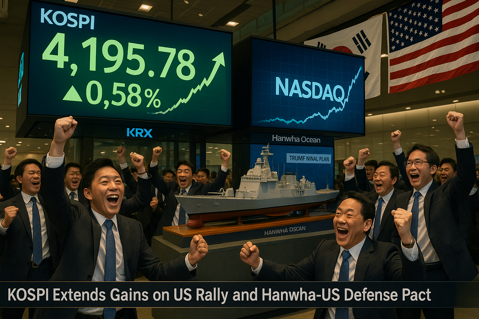 Vibrant trading floor scene capturing KOSPI's rally amid US market gains and Hanwha-US defense pact, with surging stock charts, cheering traders, flags, and warship model.
