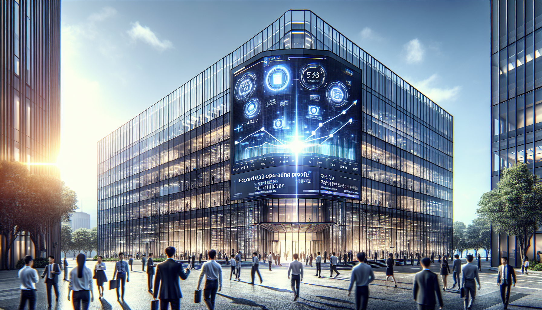 Illustration of Samsung headquarters with digital overlays of chips and profit charts, representing the company's 21% Q3 net profit rise due to AI-driven semiconductor sales.