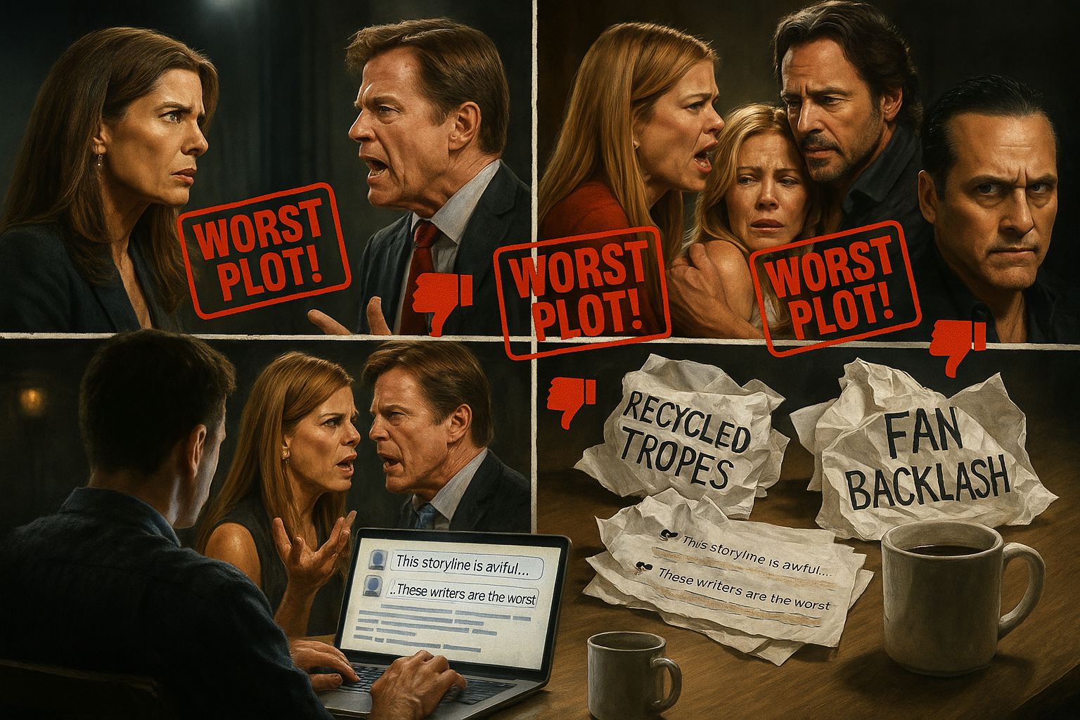 Collage illustration of frustrated soap opera stars from Days, Y&R, B&B, and GH with critic's 'worst storylines' stamps for Soap Dirt's 2025 review.