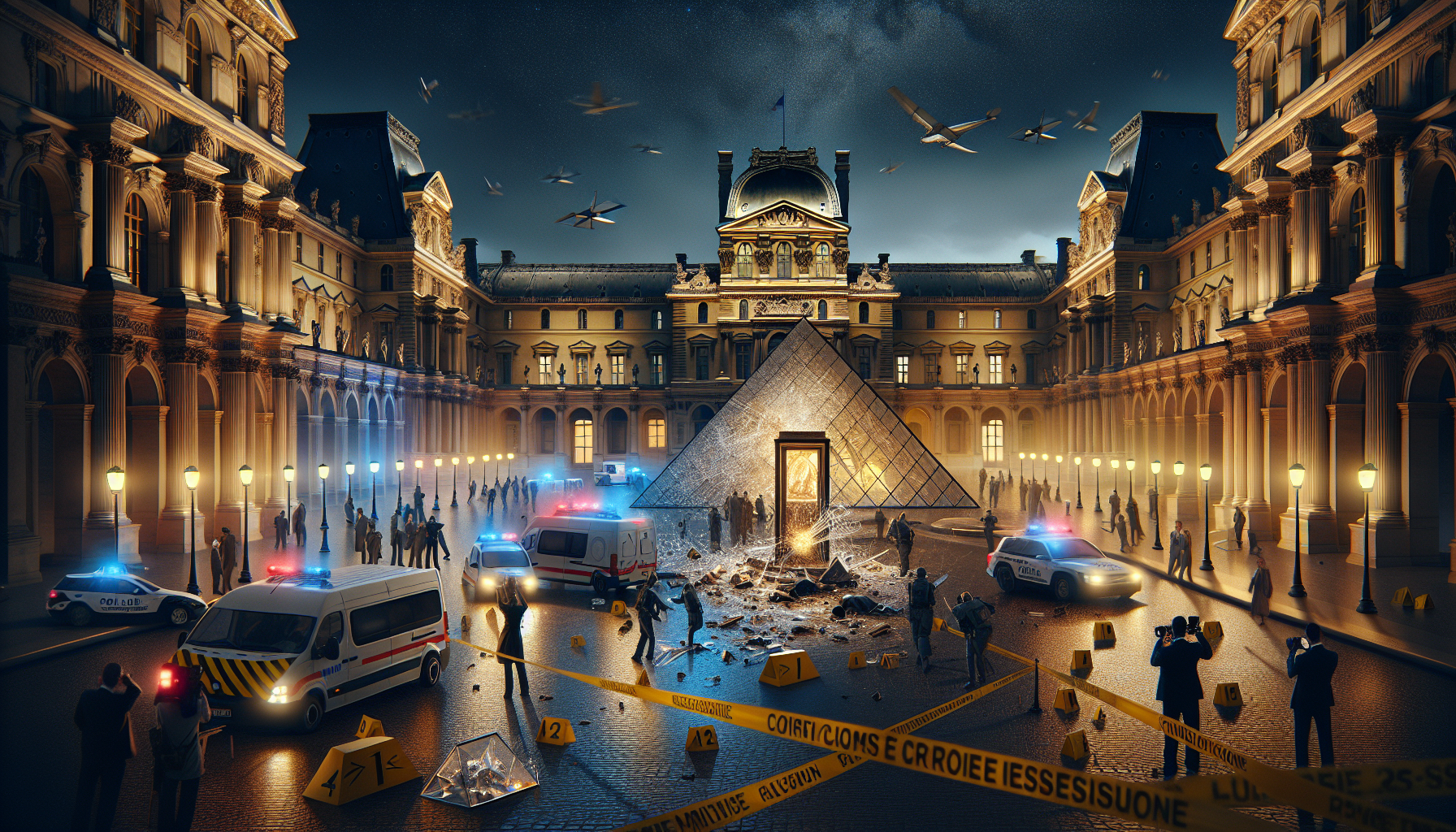 Police and investigators at the Louvre Museum following a major jewel theft, with damaged artifacts and political tension.