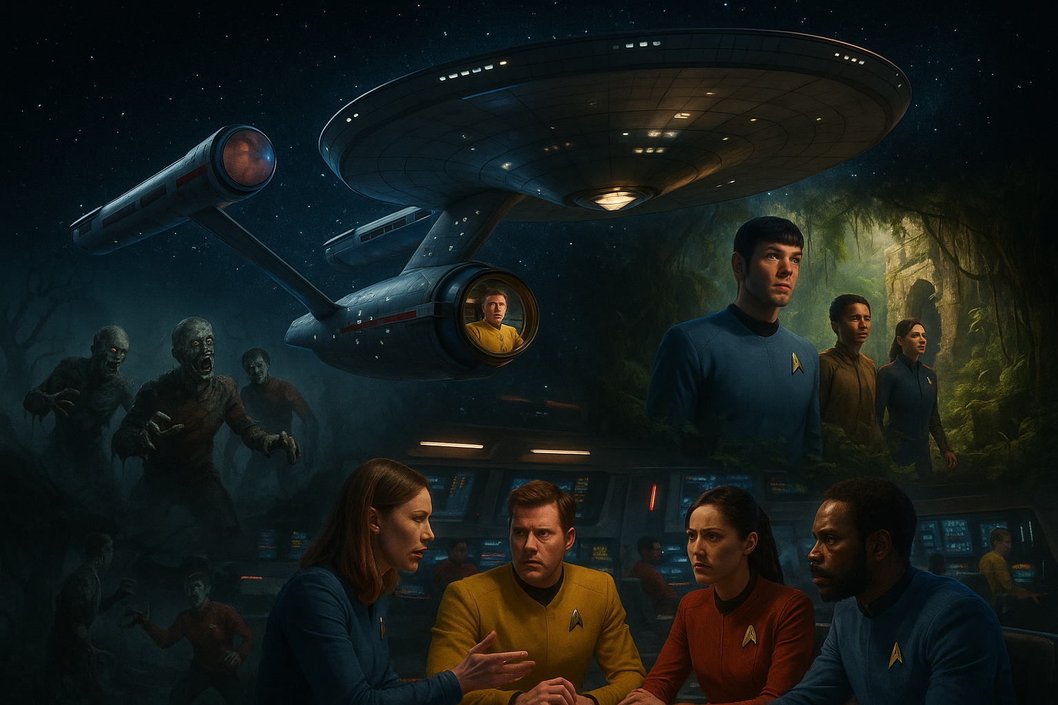 Realistic illustration showcasing the diverse themes of Star Trek: Strange New Worlds season 3, from zombie horror to adventure and drama, centered on the USS Enterprise.