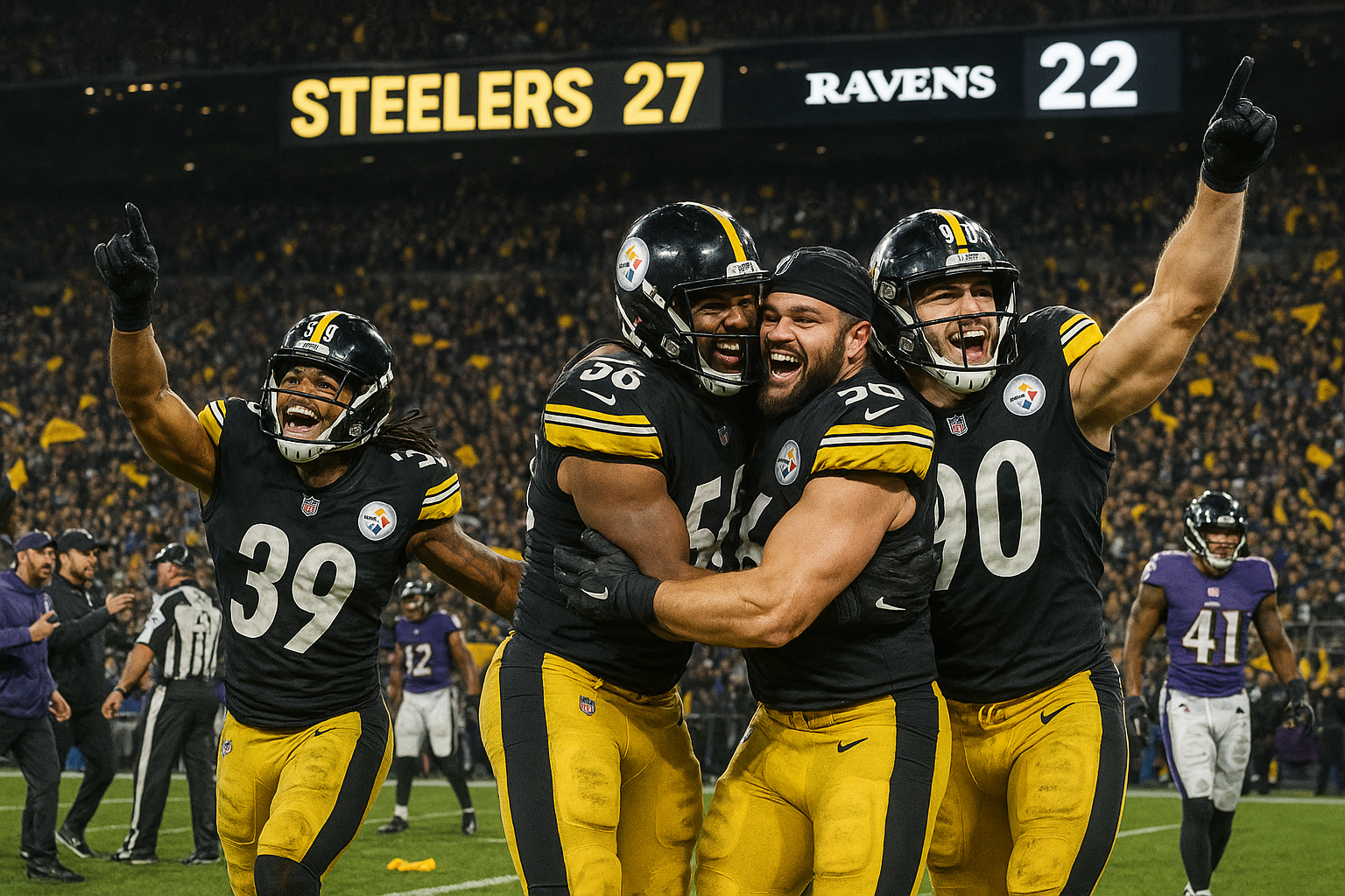 Steelers players celebrate 27-22 win over Ravens as officials face dispute in intense NFL rivalry game.