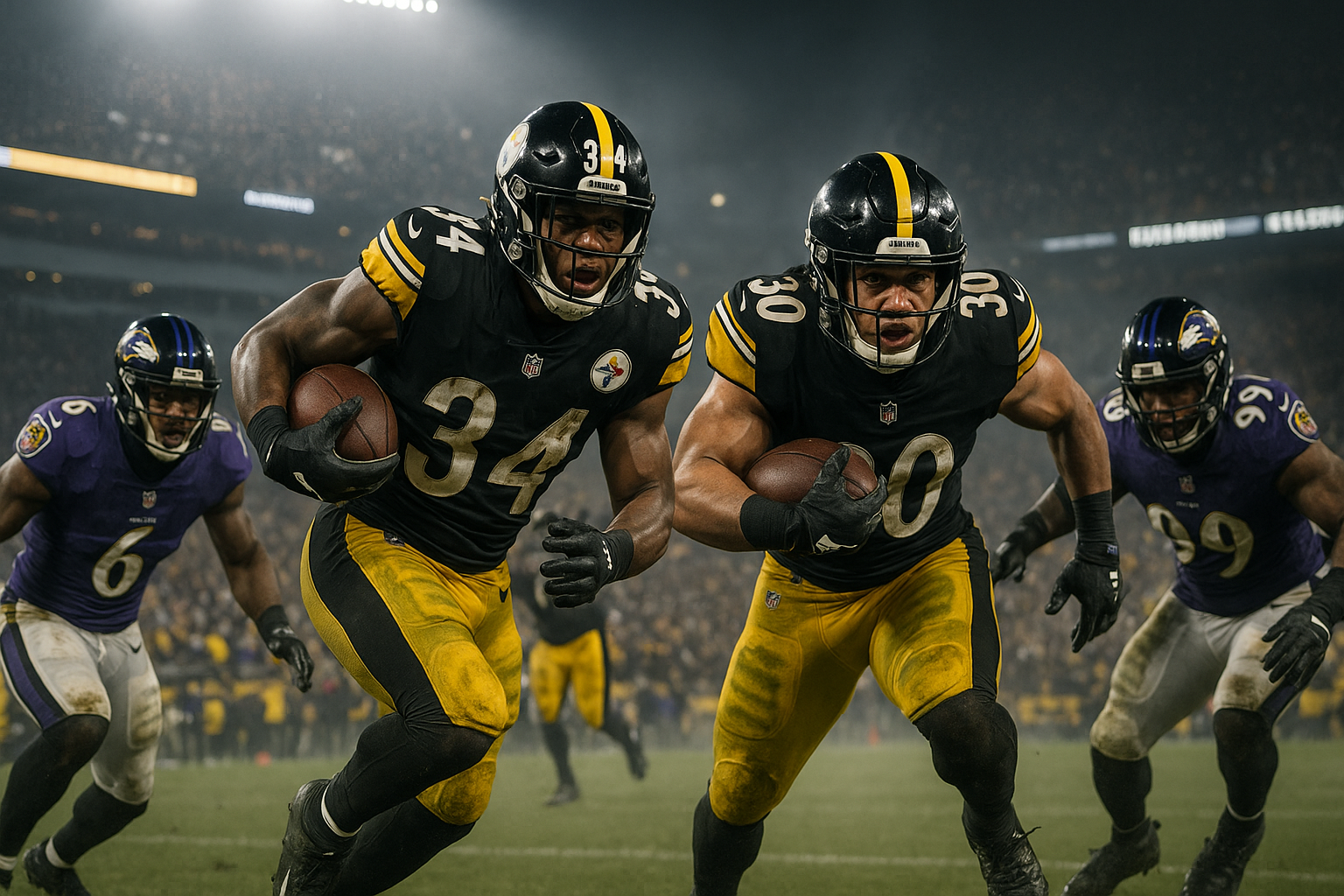 Dramatic photo-realistic illustration of Steelers RBs Gainwell and Warren battling Ravens defense in pivotal Week 18 game for AFC North title.