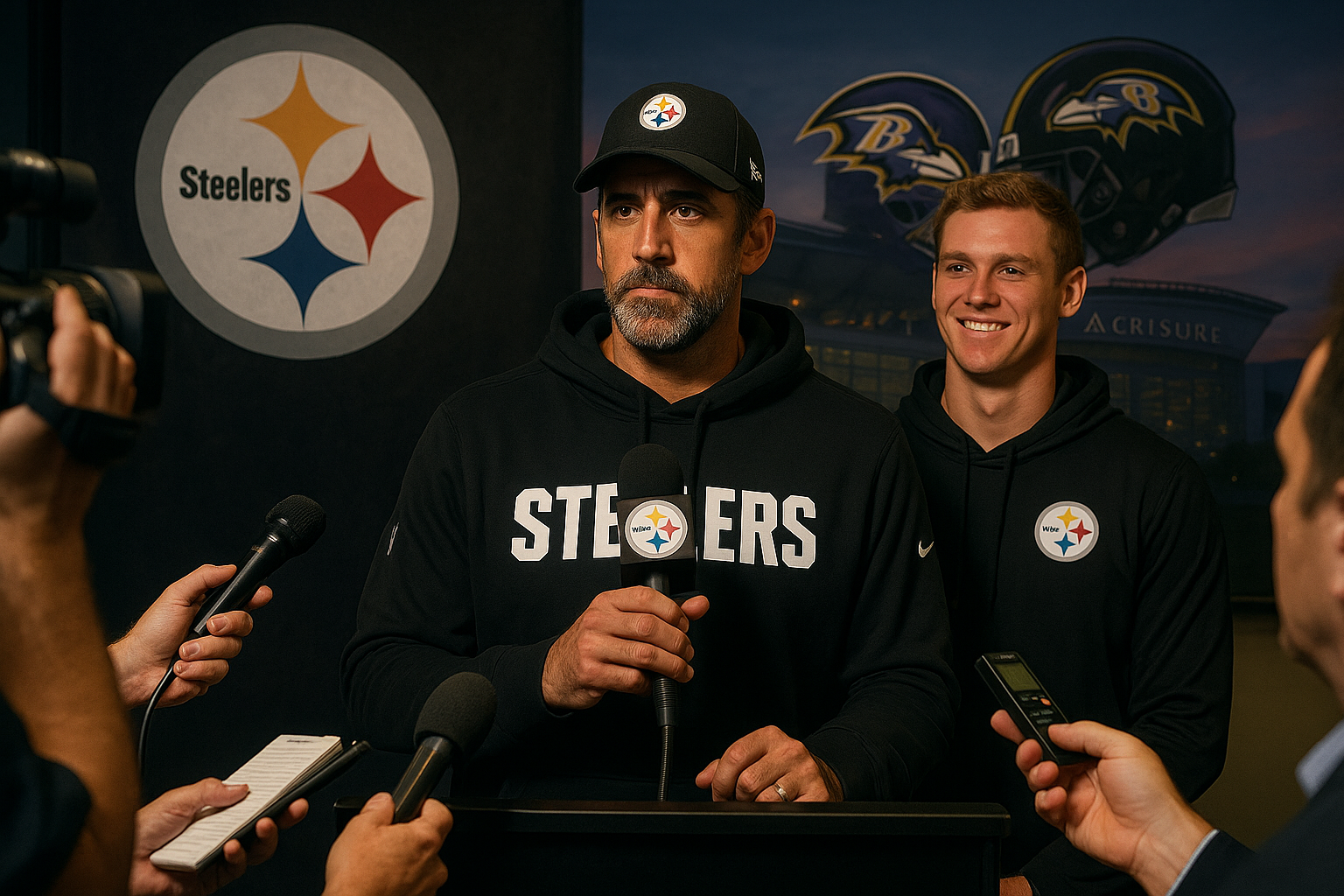 Aaron Rodgers at Steelers presser, discussing future and Pittsburgh stint with rookie Will Howard nearby, ahead of pivotal Ravens game.