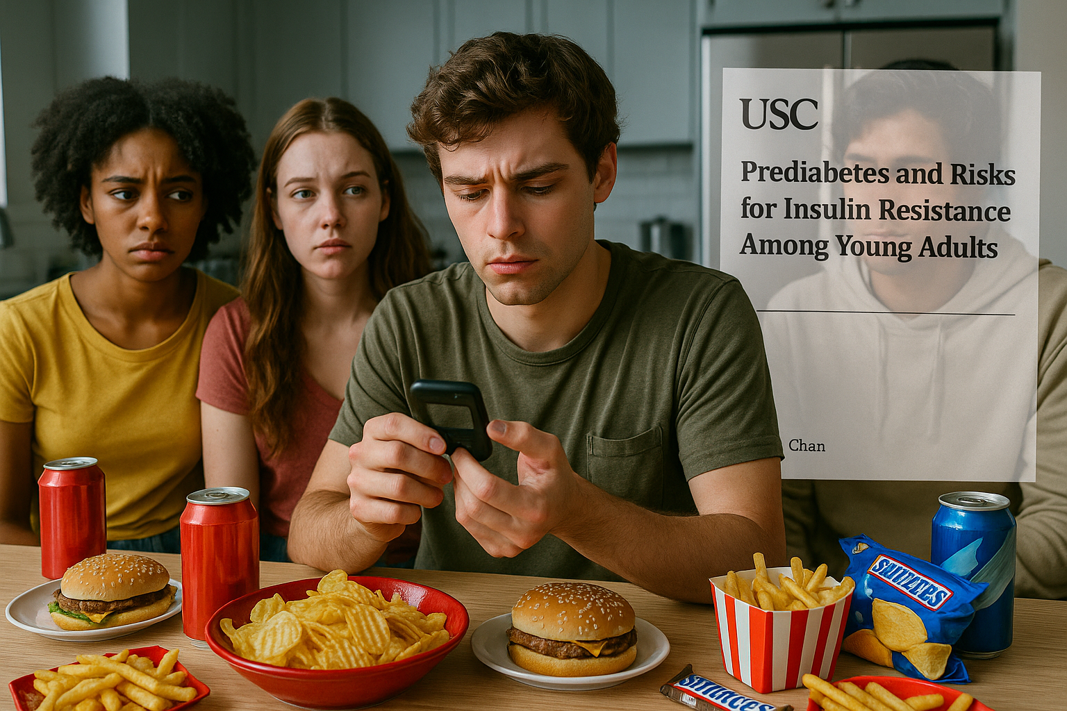 Young adults eating ultra-processed foods while one checks blood sugar, illustrating USC study on prediabetes risks.