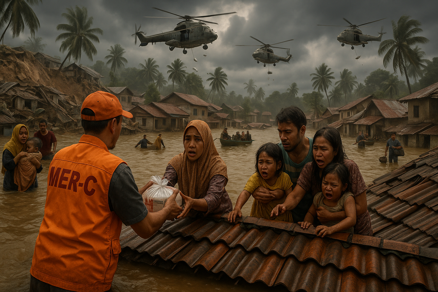 Realistic illustration of Sumatra floods: volunteers distributing aid amid floodwaters, helicopters delivering supplies, and landslide-devastated villages.