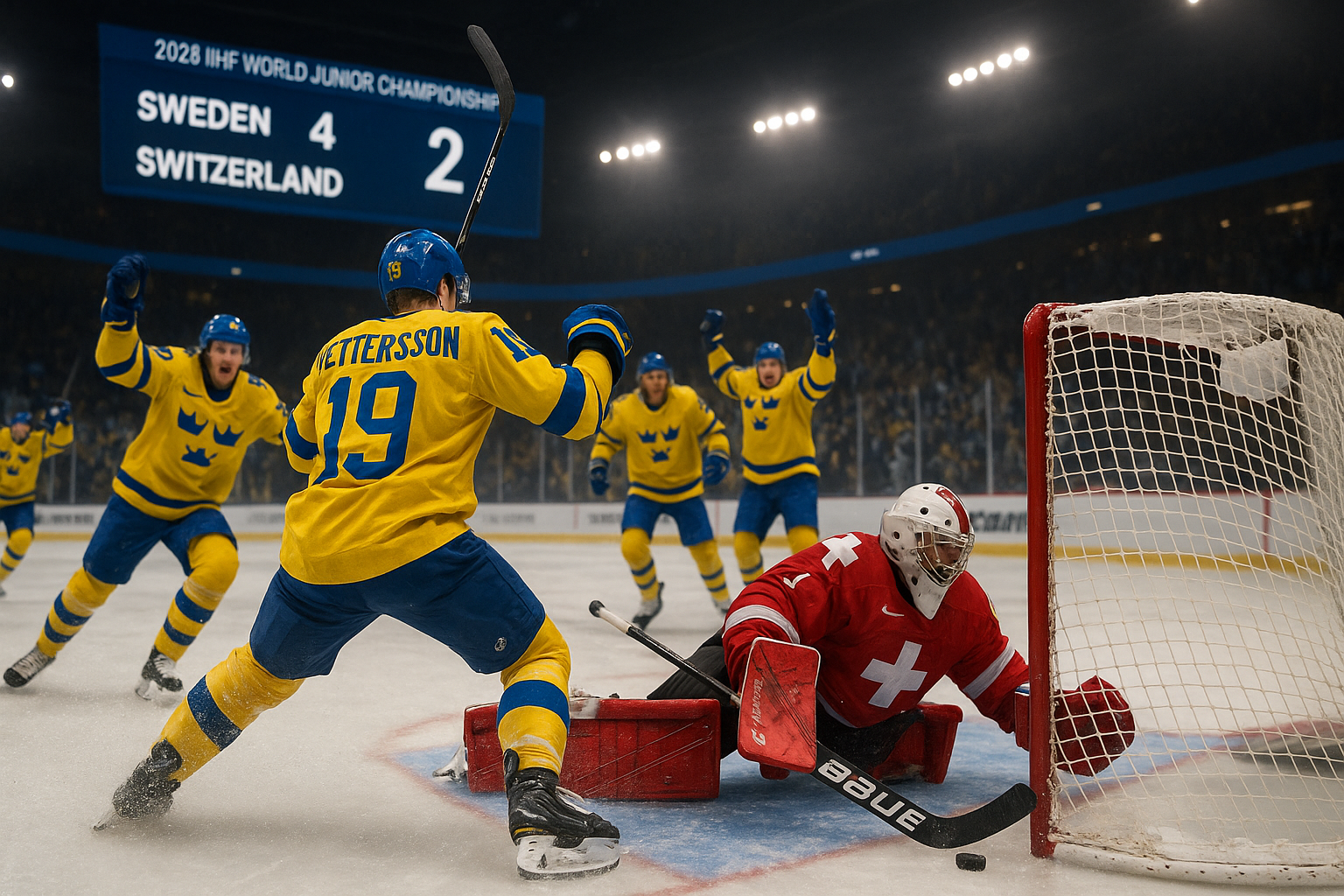 Sweden overcame a 2-1 deficit to defeat Switzerland 4-2 in their second preliminary-round game at the 2026 IIHF World Junior Championship. Lucas Pettersson scored twice in the third period to secure the victory, while Viggo Bjorck tied the game early in the frame. The evenly matched contest highlighted strong goaltending on both sides.