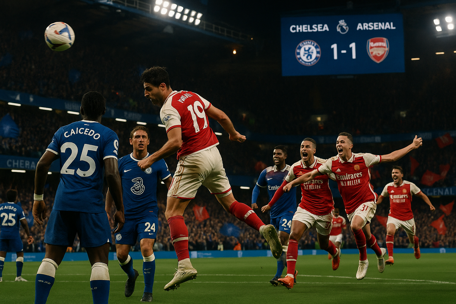 Chelsea secured a hard-fought 1-1 draw against Premier League leaders Arsenal at Stamford Bridge despite playing with 10 men for most of the match following Moises Caicedo's red card. Trevoh Chalobah headed the hosts ahead early in the second half, only for Mikel Merino to equalize with a header from Bukayo Saka's cross. The result leaves Arsenal five points clear at the top, with Chelsea remaining third.