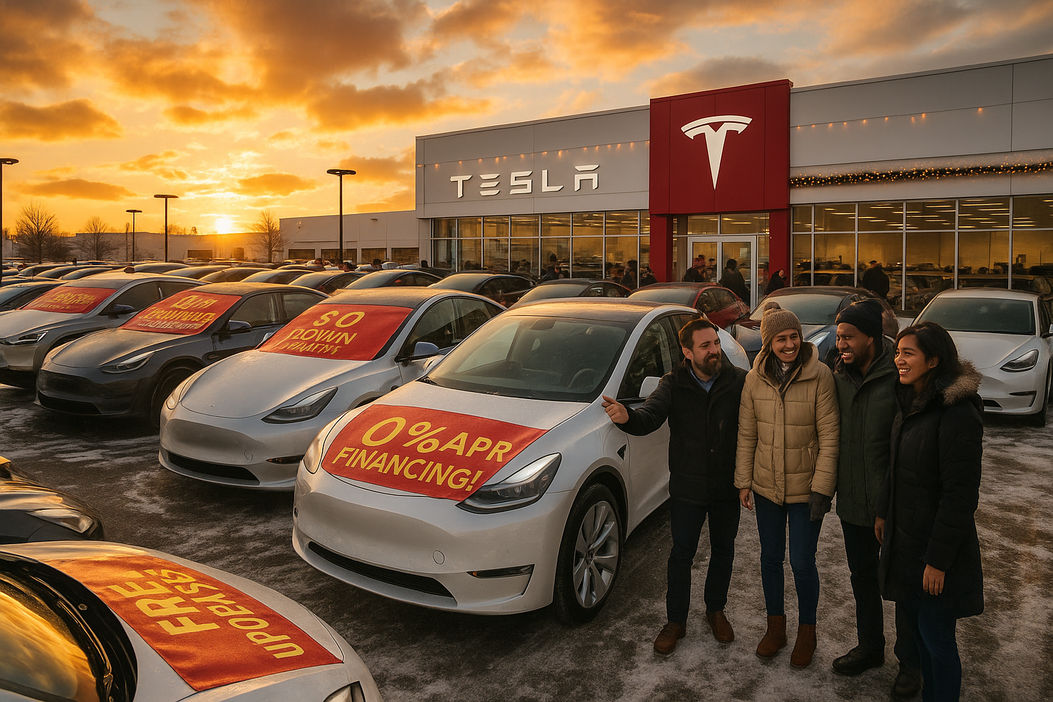 Tesla dealership showcasing end-of-year incentives with 0% APR financing, $0 down leases, and free upgrades on inventory vehicles amid winter sales rush.