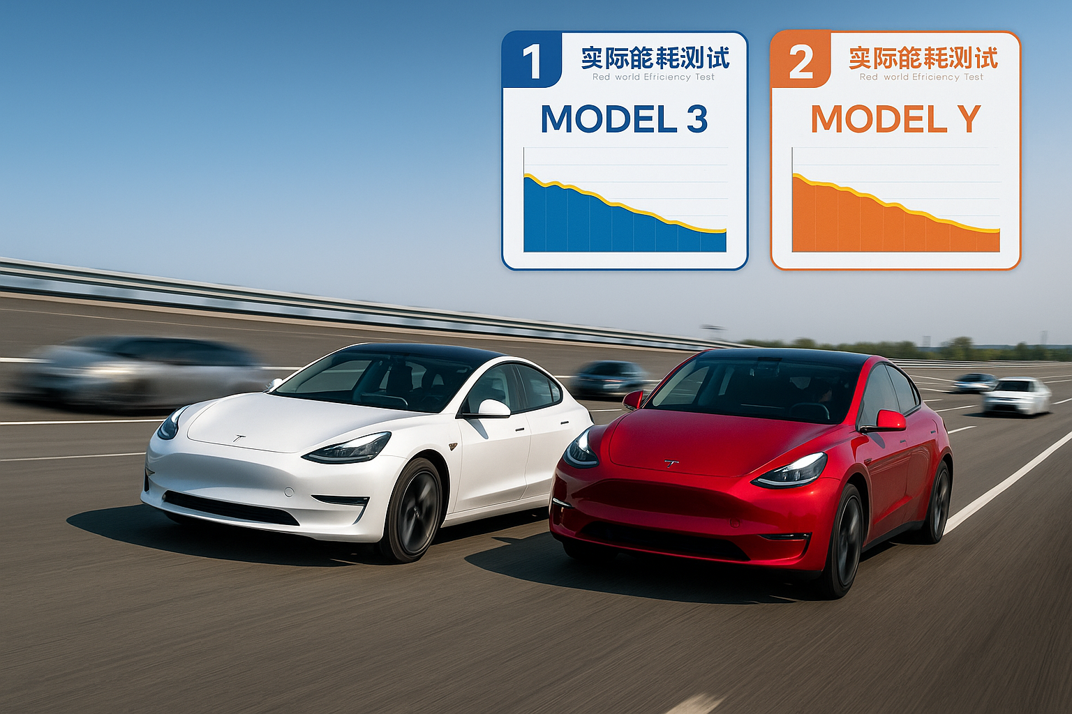 Tesla Model 3 and Model Y dominate China's EV efficiency test, leading rivals on high-speed track with ranking overlays.