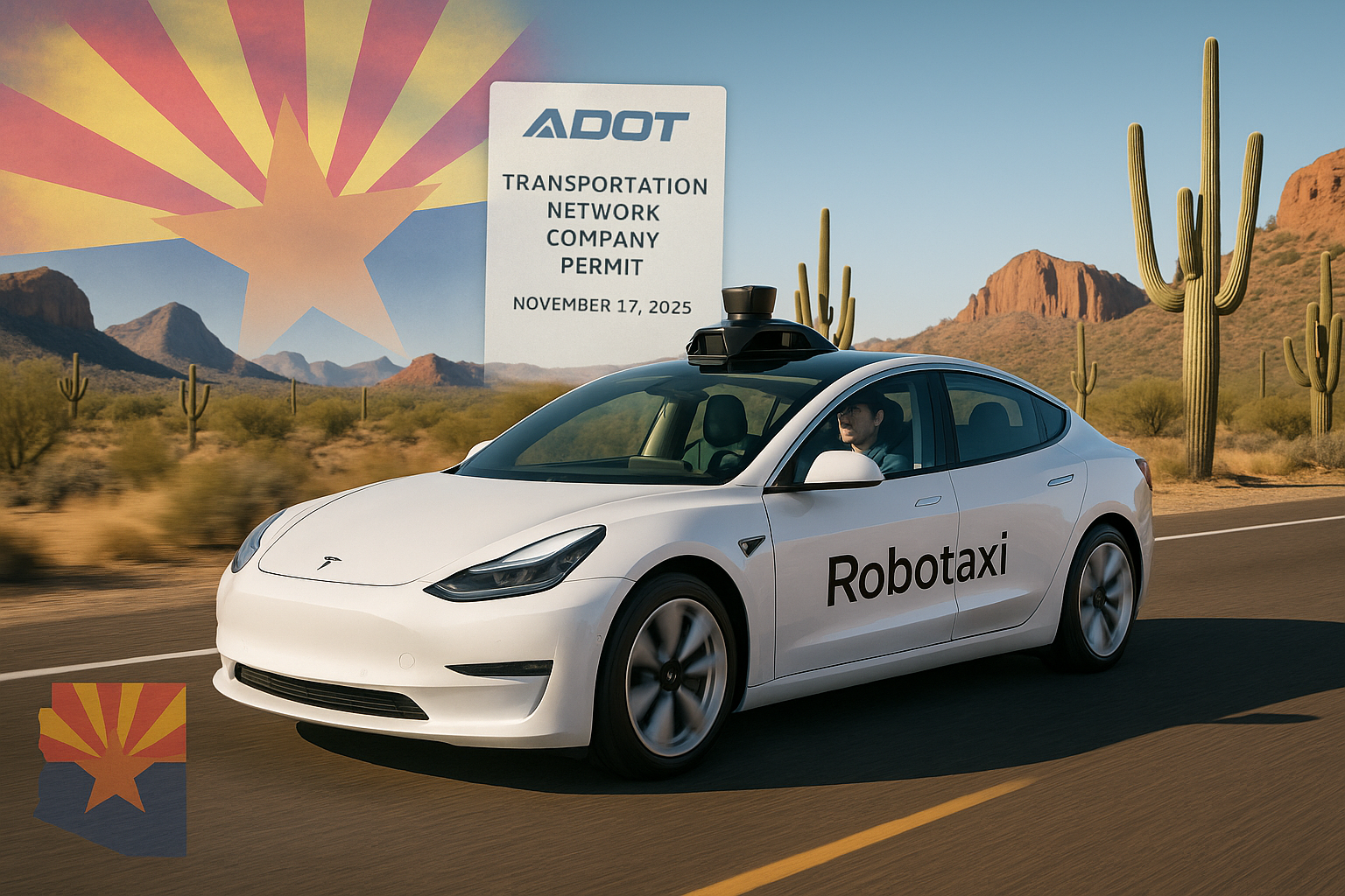 Realistic photo illustration of a Tesla robotaxi on an Arizona highway, highlighting the new ride-hailing permit approval with desert scenery.