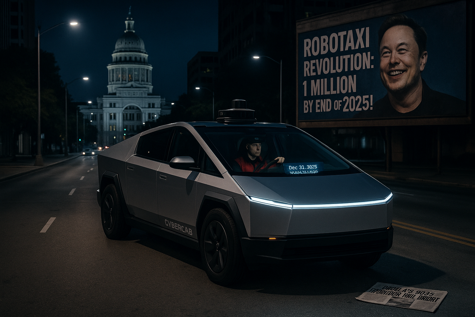Photorealistic depiction of a Tesla robotaxi with safety driver on empty Austin street, billboard of Musk's unmet 2025 promises, symbolizing delayed ambitions.