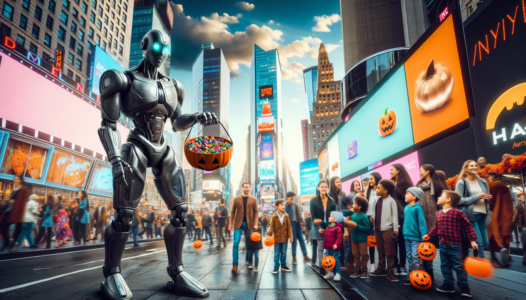 Tesla's Optimus robot distributing Halloween candy to passersby in Times Square, showcasing public AI interaction.