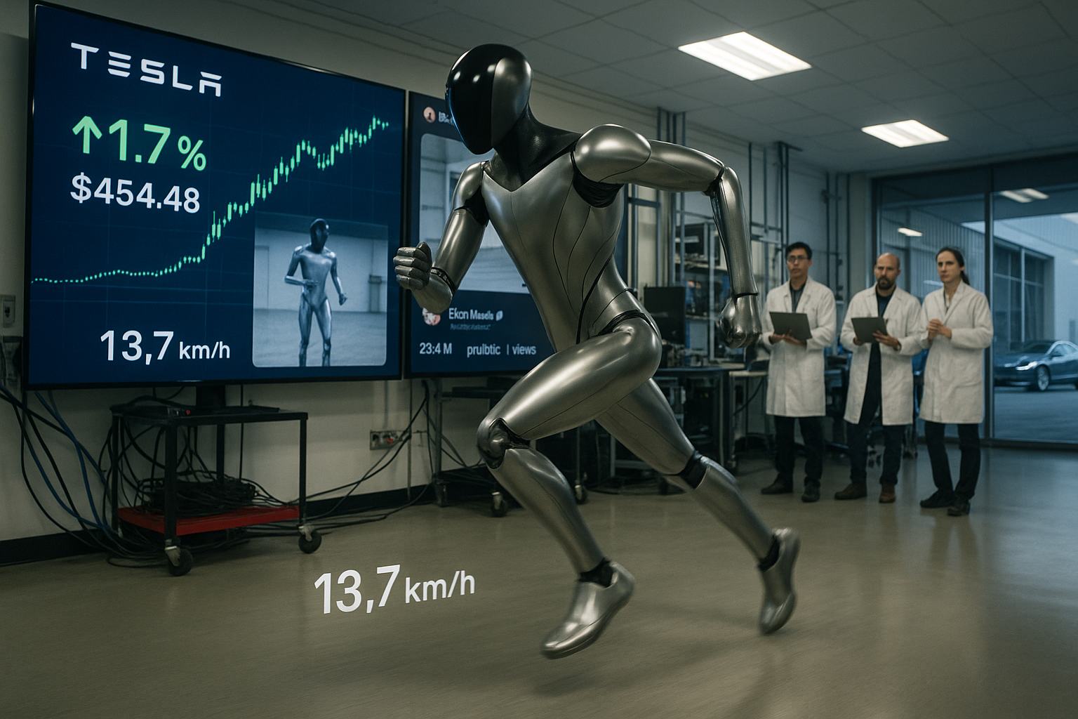 Tesla Optimus robot running swiftly in lab amid rising stock charts, Elon Musk tweet, and Figure AI rival demo.